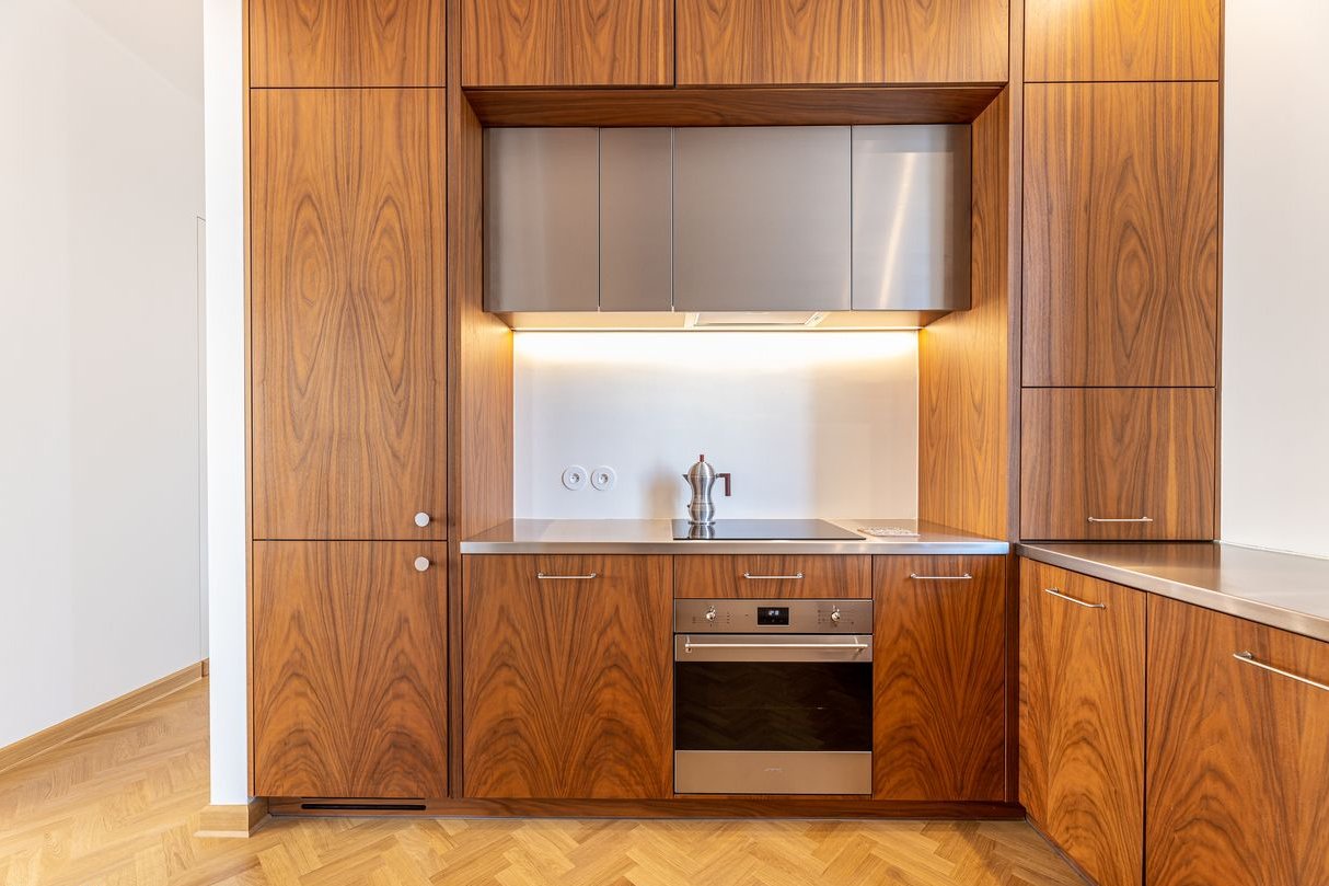 oddzielna, częściowo otwarta kuchnia z zabudową i stalowym blatem