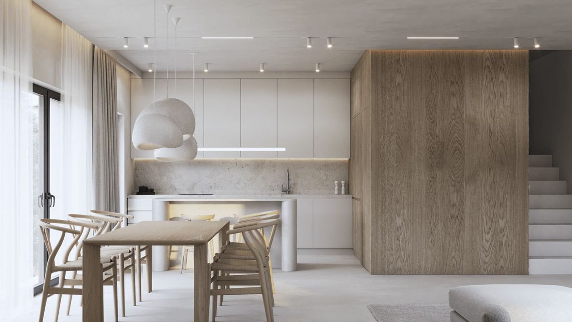 przestronny salon z jadalnią i dużymi przeszkleniami otwierającymi się na ogród,
