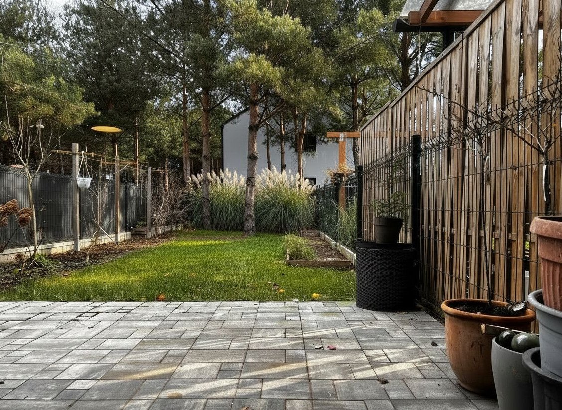 działka o powierzchni 250 m², z licznymi zadrzewieniami, zapewniającymi prywatność