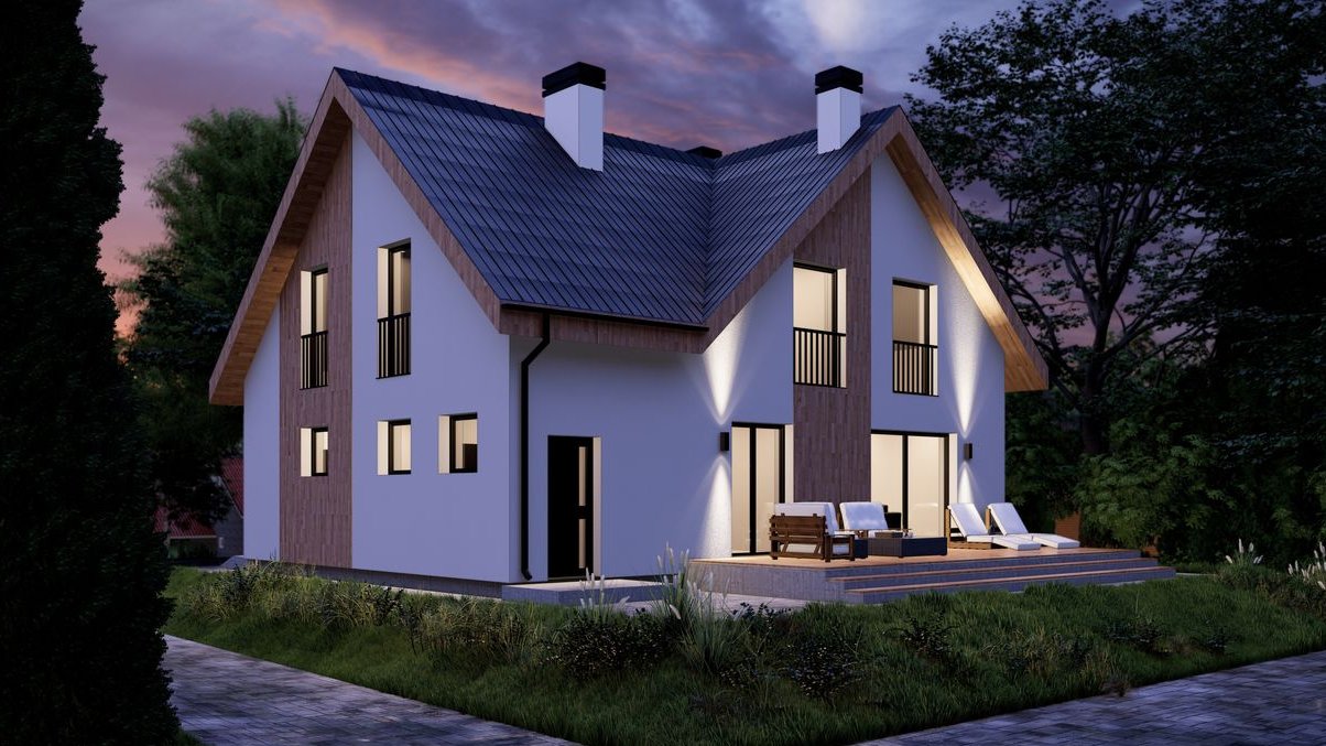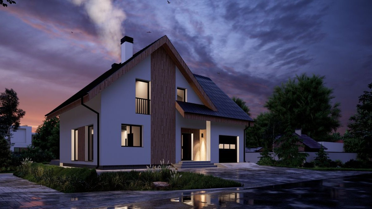 W domu zaprojektowano ogrzewanie pompą ciepła, okna PCV trzyszybowe, drzwi antywłamaniowe oraz automatyczną bramę garażową.