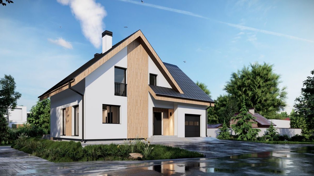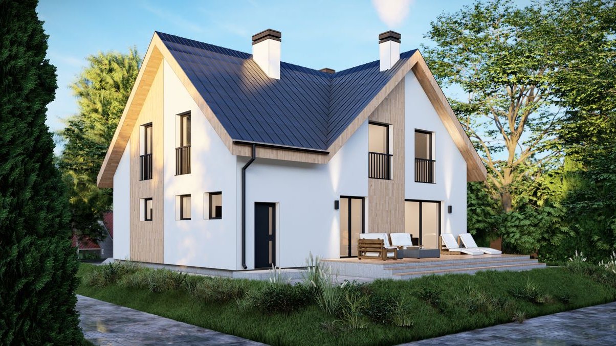 W projekcie uwagę zwraca efektownie zaprojektowana strefa ogrodowa z atrakcyjnym ryzalitem oraz oryginalną pergolą nad tarasem. Panoramiczne przeszklenia otwierają widok na zieleń ogrodu i naturalnie doświetlają wnętrza. Otwarta strefa dzienna domu zachwyca przestronnością oraz szerokim wyjściem na taras.