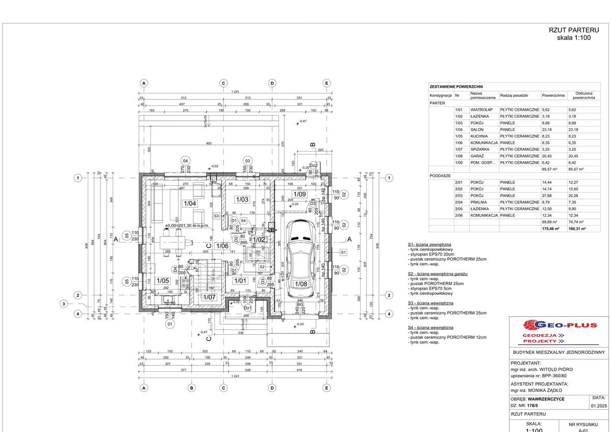 Na parterze znajdują się: salon, aneks kuchenny z jadalnią, spiżarnia, pokój, łazienka z WC, garaż oraz kotłownia. Do części mieszkalnej wchodzi się przez wiatrołap i hol.