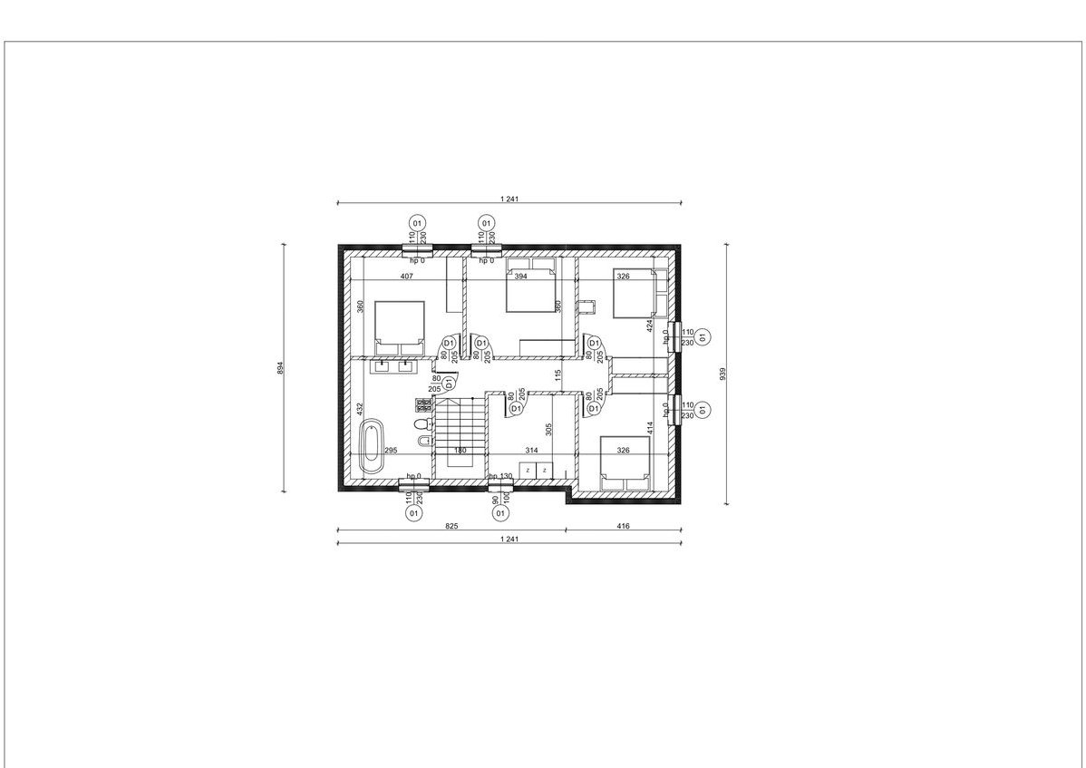 Na drugą kondygnację prowadzą żelbetowe schody. Na piętrze, wokół holu, znajdują się trzy sypialnie, duża łazienka oraz pomieszczenie gospodarcze (pralnia/garderoba). Projekt daje możliwość aranżacji od 3 do 5 pokoi na drugiej kondygnacji – w zależności od potrzeb rodziny. Przybliżone warianty przedstawiono na rysunkach.
