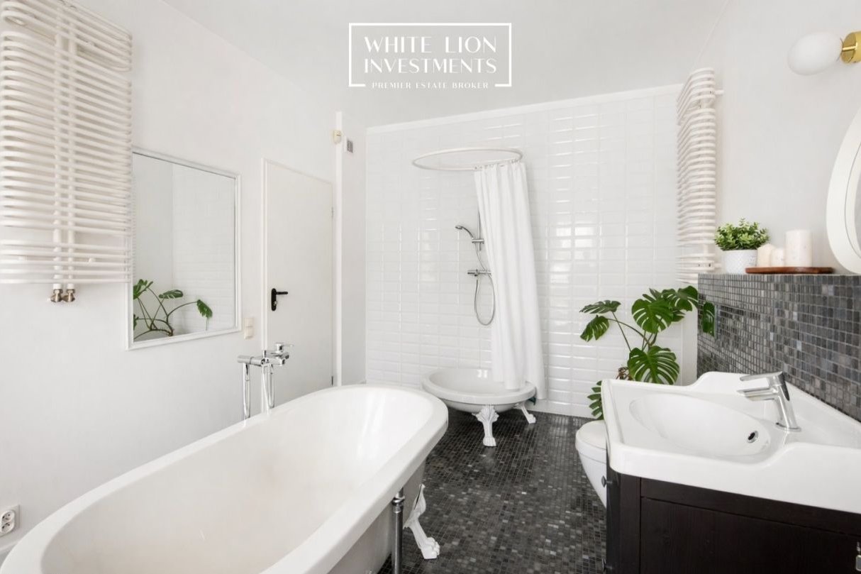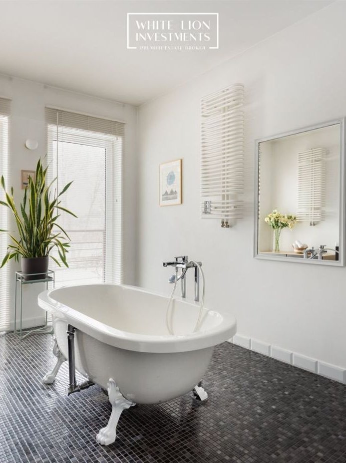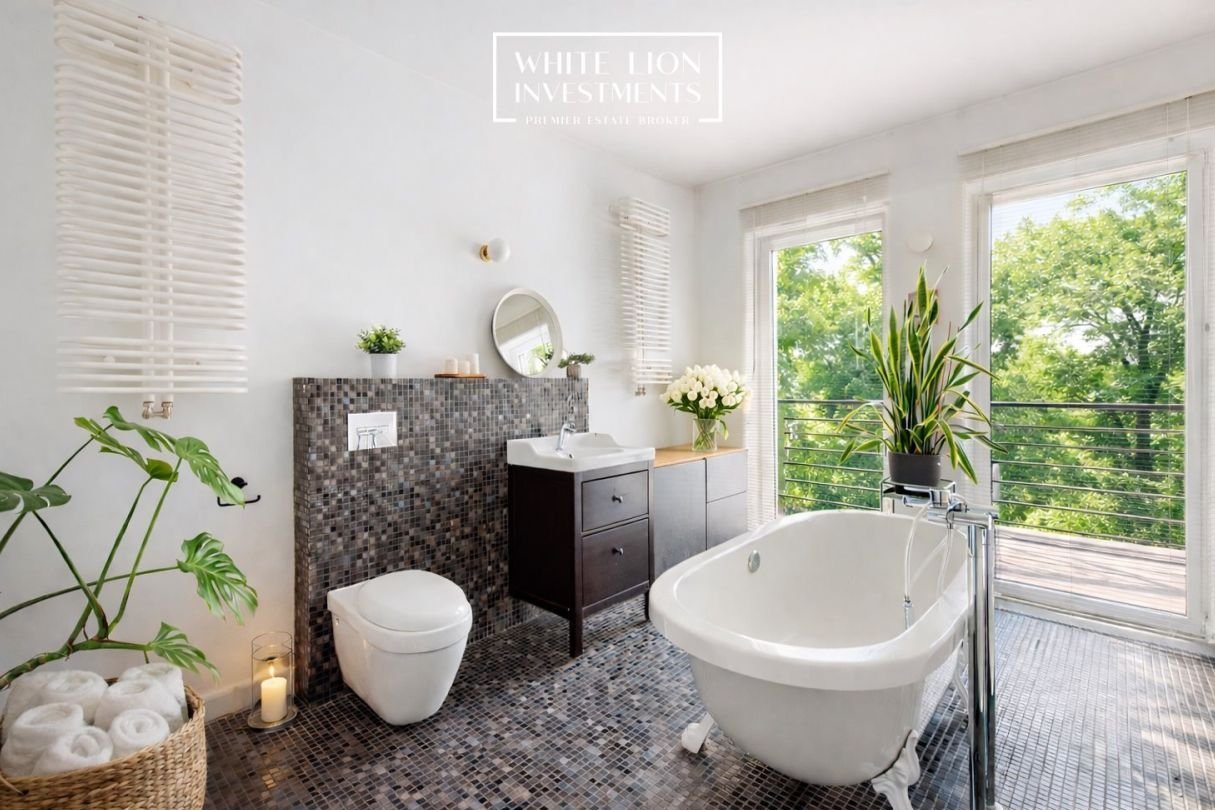 przestronny salon kąpielowy (ok. 13,5 m²) z wanną i wyjściem na balkon
