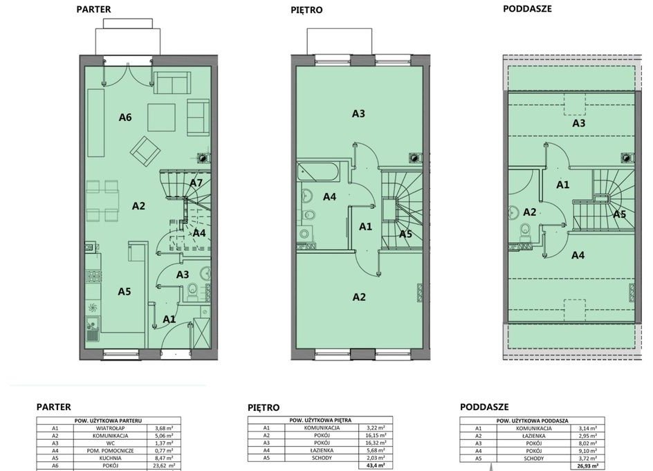 Parter: salon z jadalnią i wyjściem na ogród, otwarta kuchnia, toaleta, wiatrołap, schowek