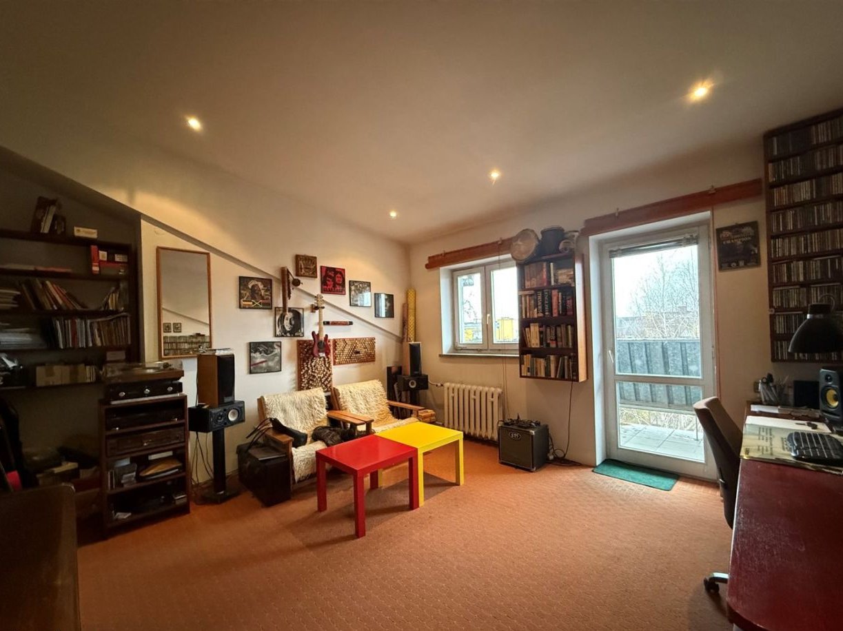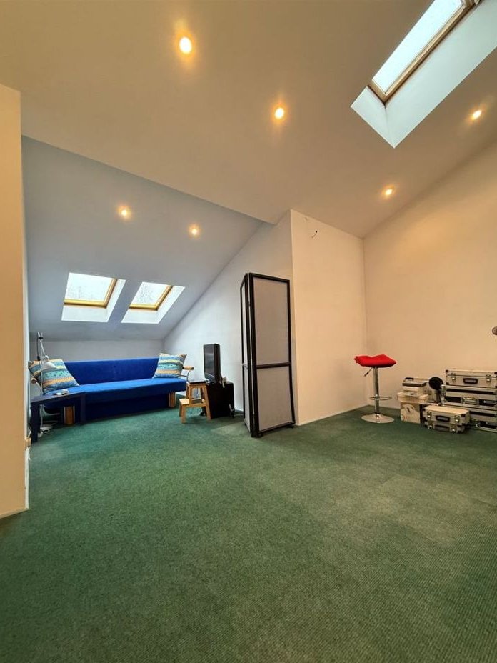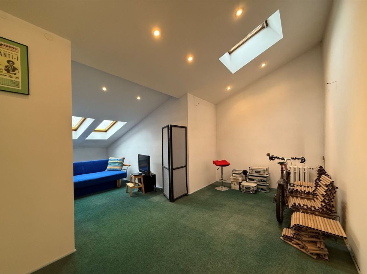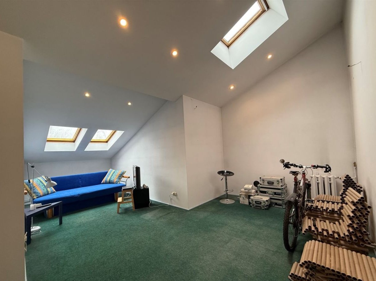 • 2 połączone ze sobą pokoje o łącznej powierzchni liczonej po podłodze ok 27 mkw (sufit wysokości 1,2-3,8m). Możliwość wydzielenia pokoi z uwagi na okna które są w każdym z pomieszczeń.