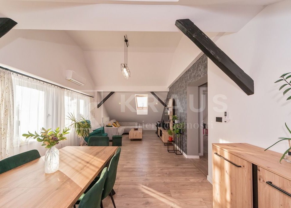 Wnętrza zaaranżowane są w spokojnej, jasnej tonacji, wysokie sufity tworzą cudowną atmosferę, drewniane belki dopełniają całości.