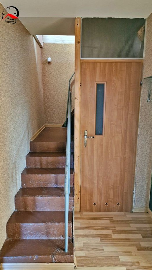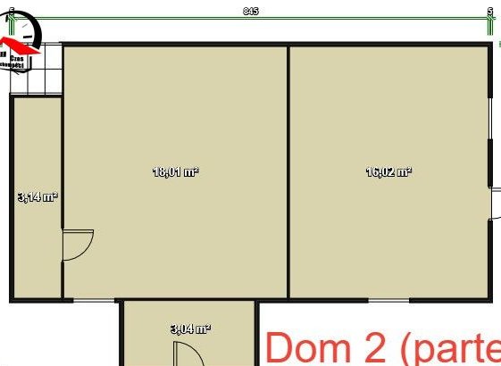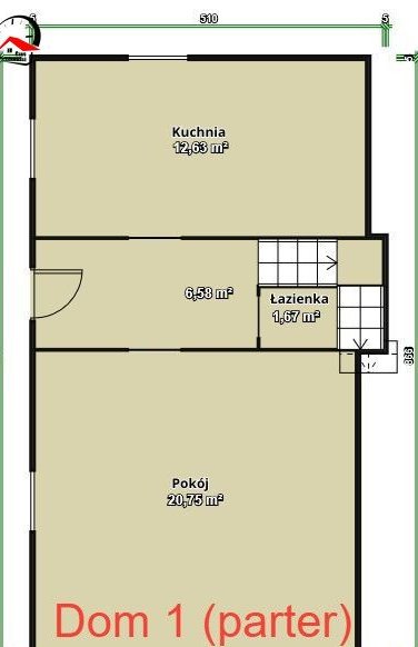 Pierwszy tzw. dom (około 90 m2, powierzchni całkowitej) , właściwie (bliźniak lewa strona) , oczywiście na całkowicie odrębnej działce, z osobną księgą wieczystą, składający się na parterze z bardzo dużej kuchni, przedpokoju pokoju gościnnego i małej łazienki pod schodami, na piętrze (które jest w stanie bardzo dobrym) znajdują 2 sypialnie i piękna nowoczesna łazienka.