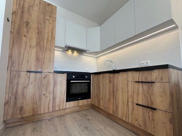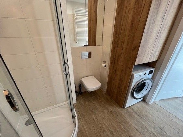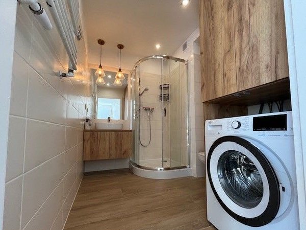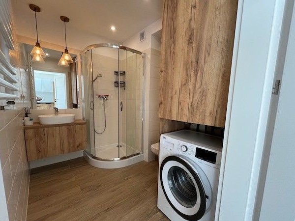 Zabudowa kuchni wraz ze sprzętem AGD pozostaje w cenie mieszkania, w łazience pralka.