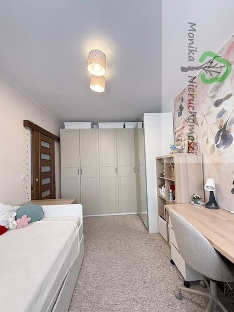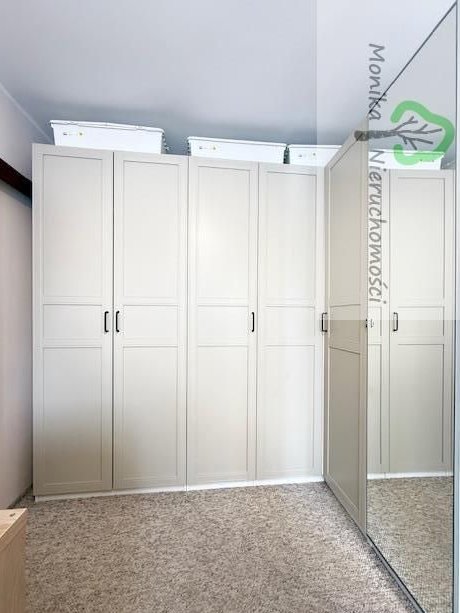 - Pokój z pojemnymi szafami PAX IKEA oraz wykładziną podłogową