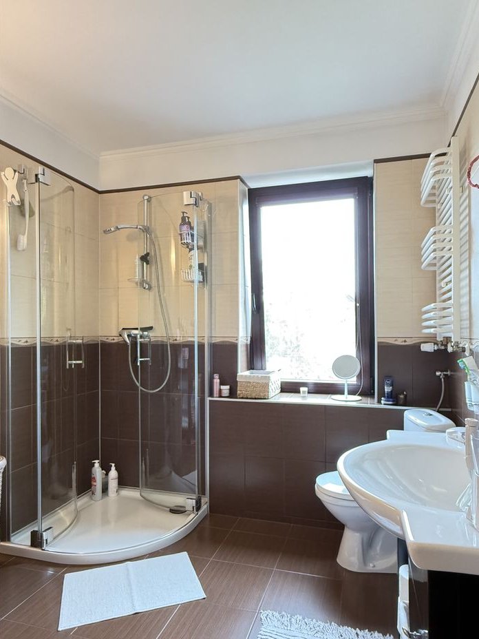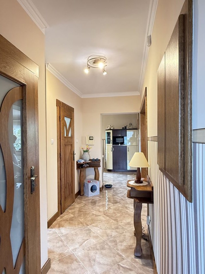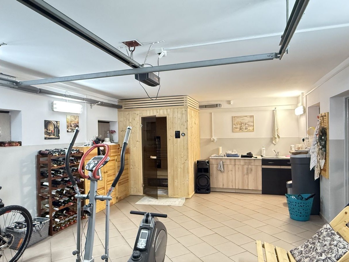 Parter połączony jest z częścia piwniczną (budynek w całości podpiwniczony) w której znajduje się bardzo ładny garaż wykorzytywany obecnie na cele fitneess, miejsce na rowery itp. i co najważniejsze w części tej została zainstalowana profesjonalna sauna.