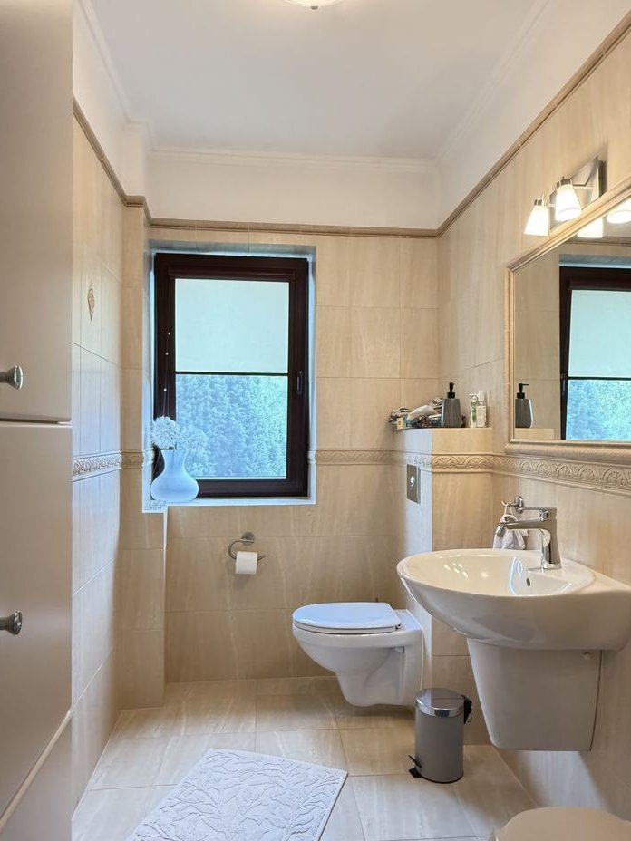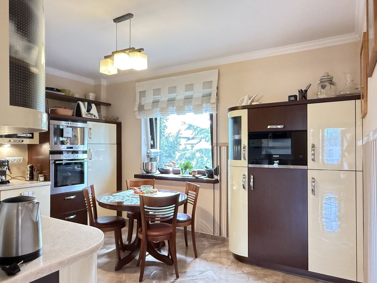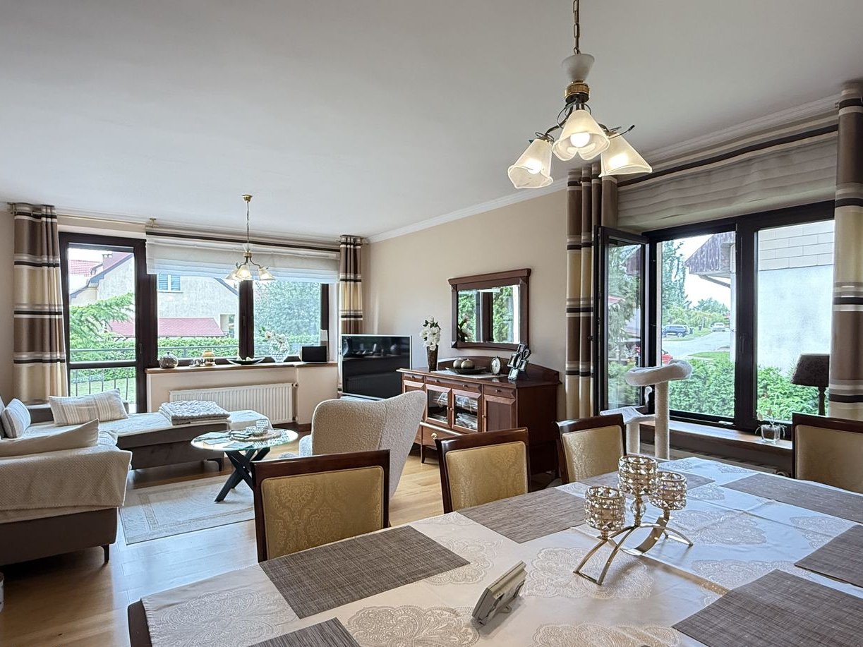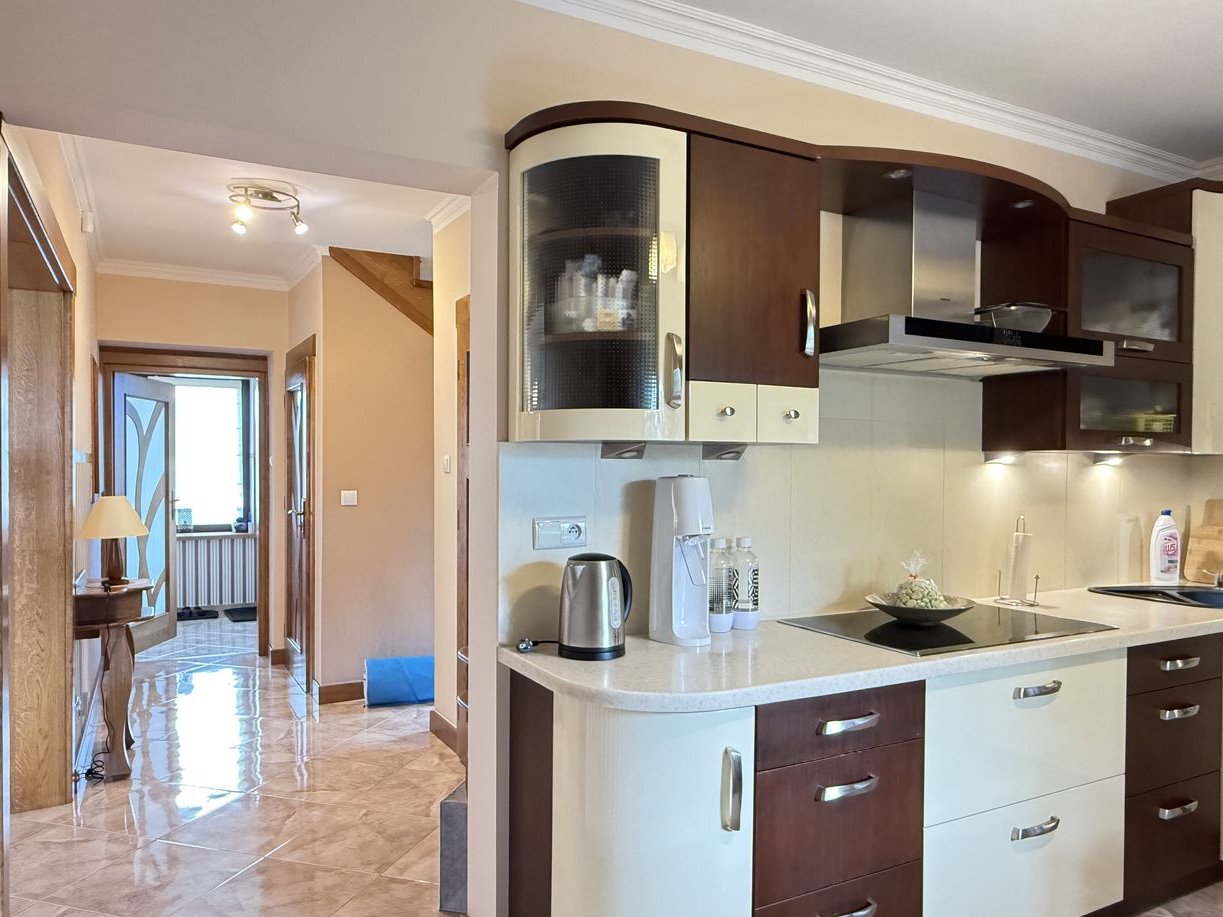 - wysoki parter na którym znajduje sie duży salon z wyjściem na taras, osobna duża kuchnia z meblami w zabudowie stałej i sprzętem AGD ( min. ekspress do kawy w zabudowie, piekarnik, zmywarka), korytarz, toaleta i ganek.