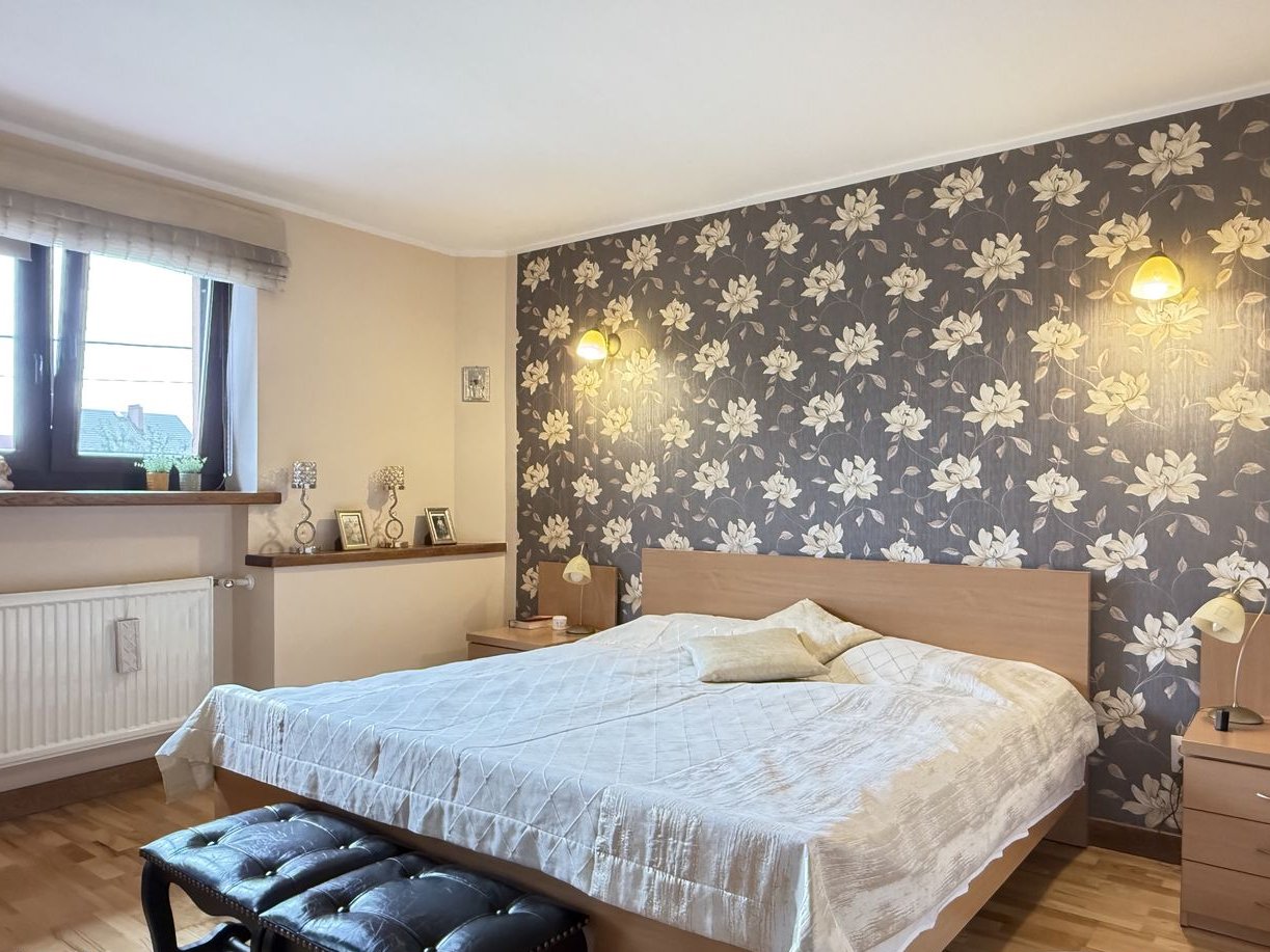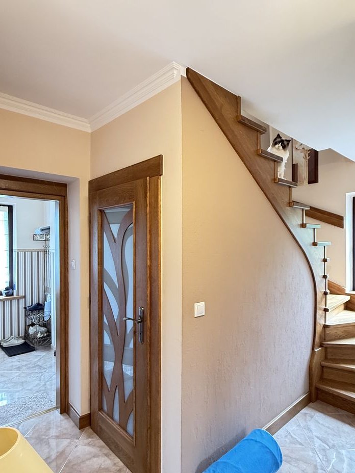 - na piętro budynku z patreru prowadzą dębowe schody, w skład powierzchni na piętrze wchodzi duża łazienka, sypialnia z szafą w zabudowie, dwa pokoje.