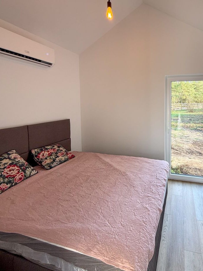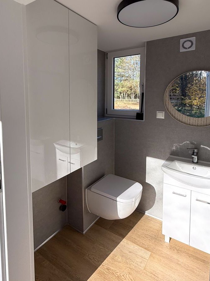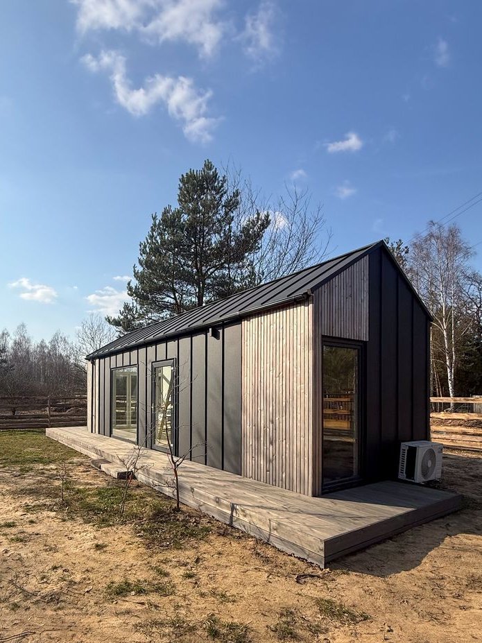 Nowoczesny i wysokiej jakości domek. Konstrukcja ze sztywnej ramy stalowej zabezpieczonej antykorozyjnie, certyfikat CE. Ocieplenie pianą 14 cm, dach piana 14 cm a podłoga piana 10 cm. Na dachu blacha panelowa w rąbek. Elewacja blacha w rąbek i termo sosna. Dokładną specyfikację domu materiały i komponenty oraz projekty posiadam do wglądu.