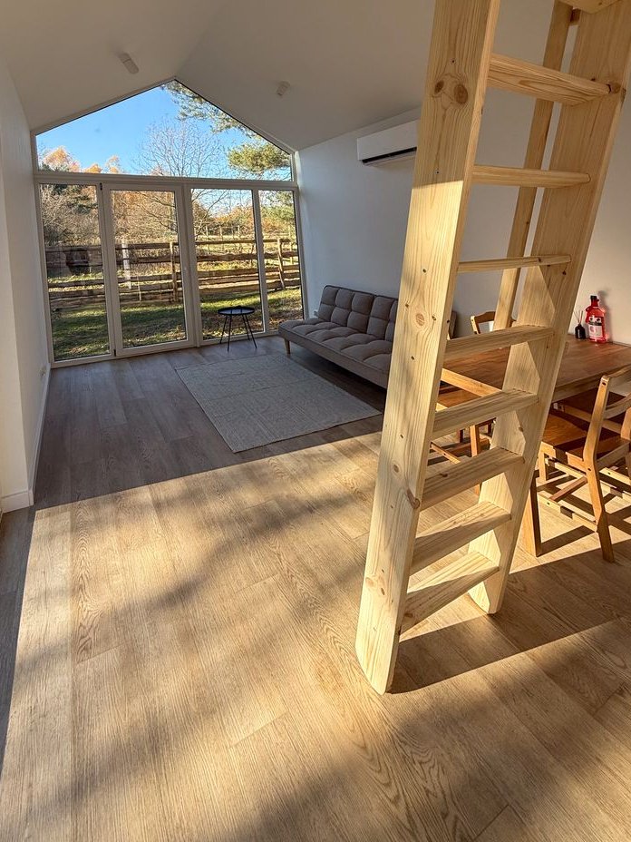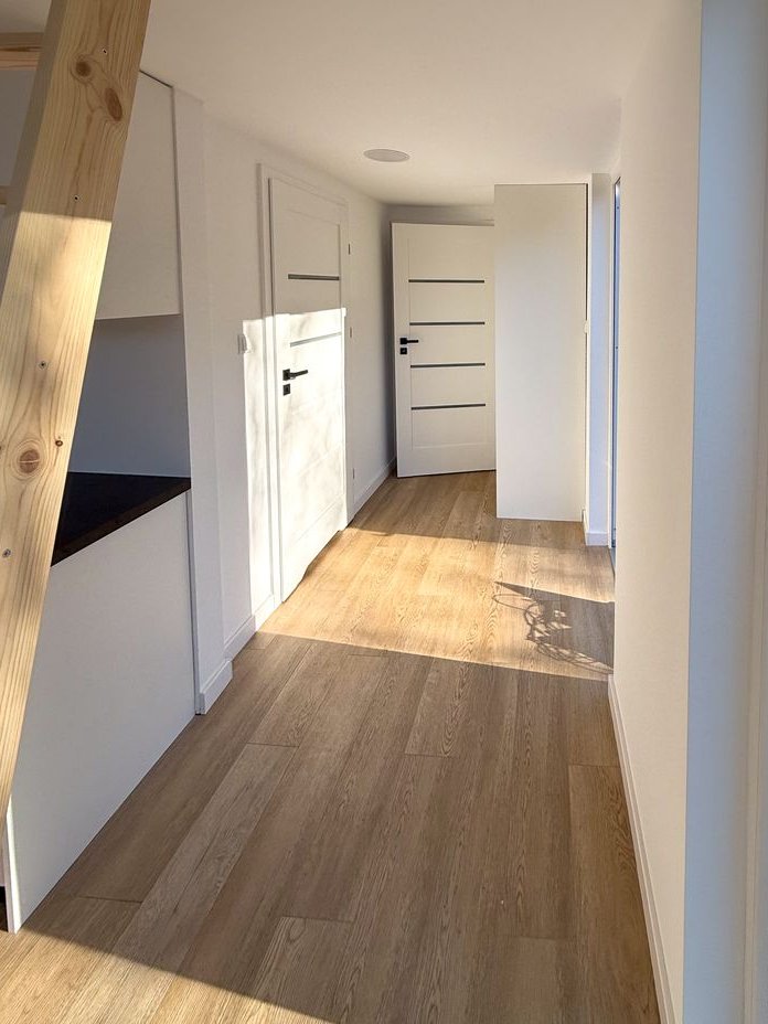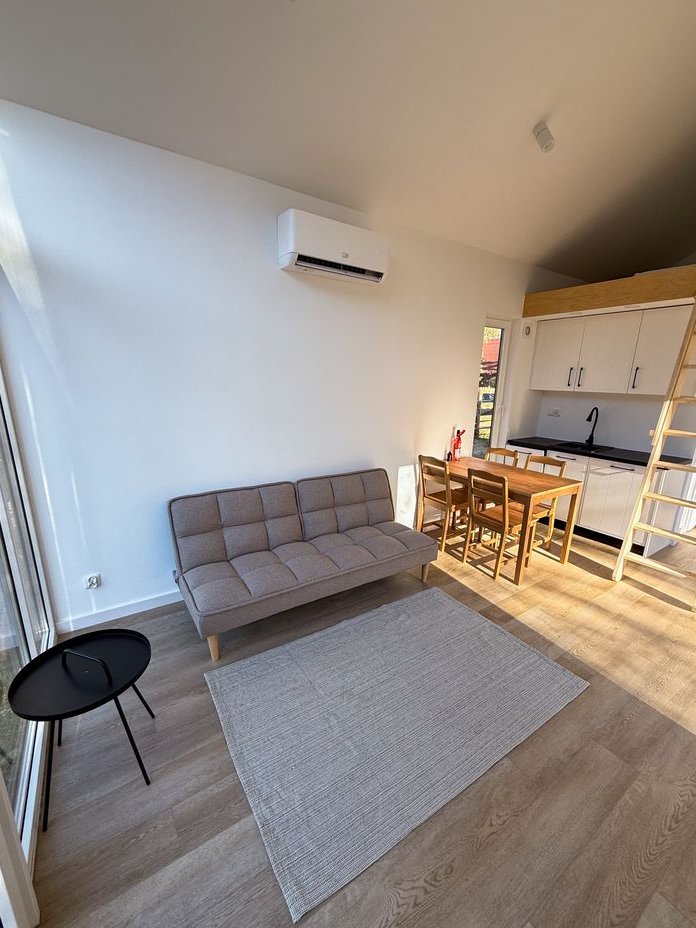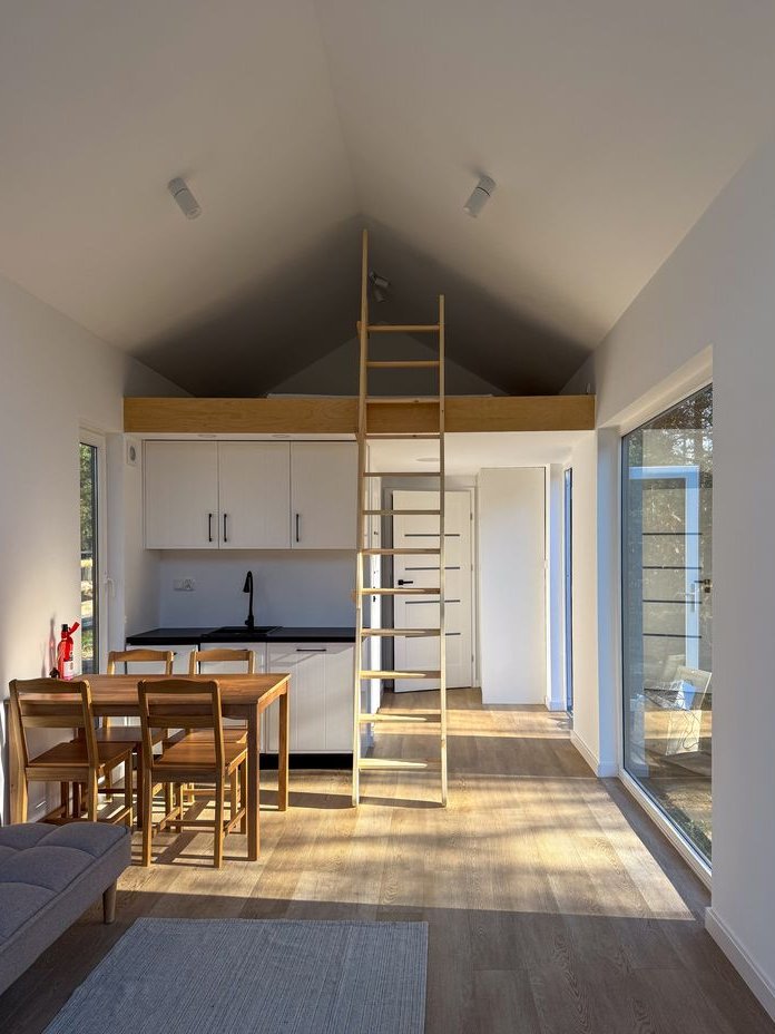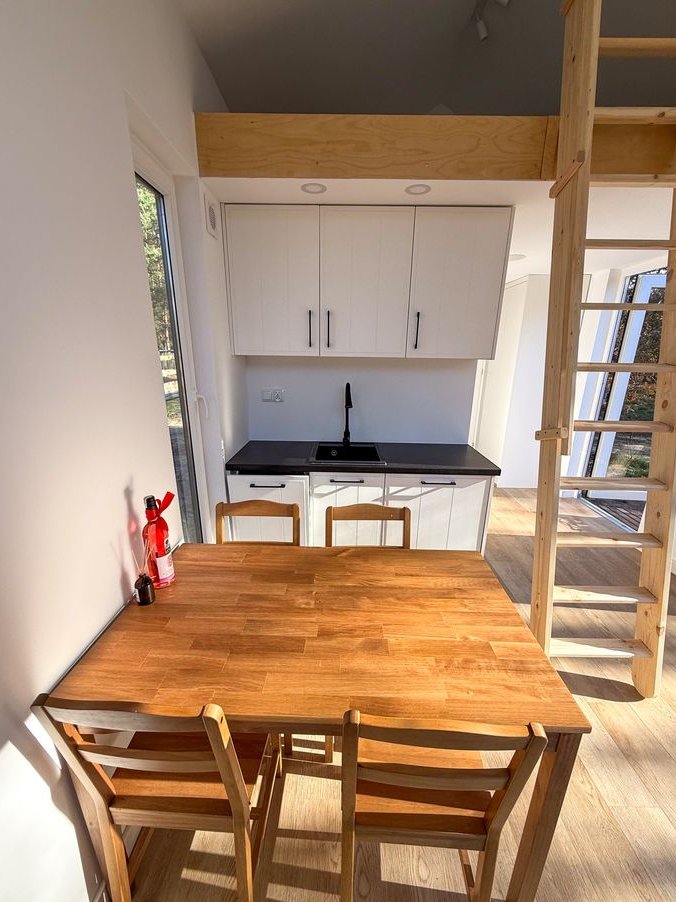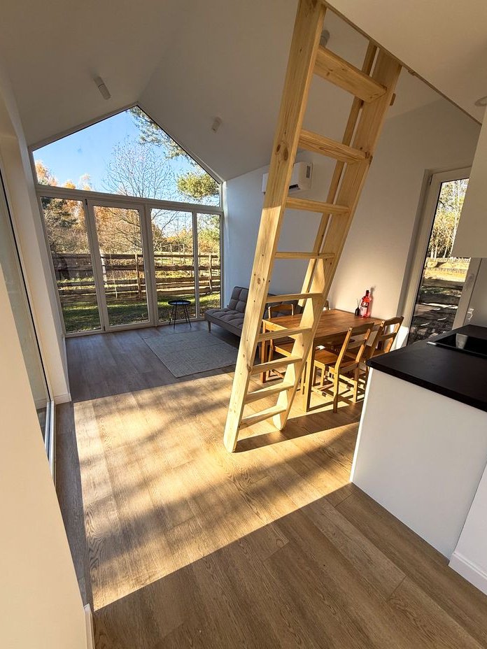 Dom składa się przedpokoju, łazienki, oddzielnej sypialni oraz dużego salonu z antresolą i aneksem kuchennym. Na piętrze znajduje się antresola oraz pokój z dużym oknem.