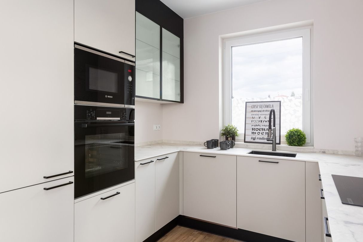 zabudowa kuchenna wraz ze sprzętem AGD - płyta indukcyjna, lodówka, zmywarka, piekarnik, mikrofalówka, okap