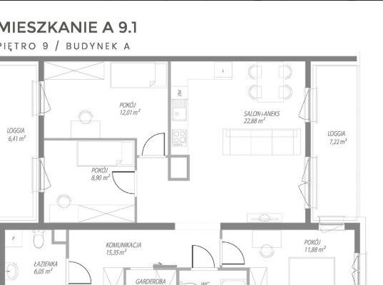 Salon z aneksem kuchennym (22,88 m²): Jasne, reprezentacyjne serce domu. Bez trudu zmieścisz tu duży stół dla rodziny, wyspę kuchenną oraz wygodną sofę. Z salonu wyjdziesz na pierwszą loggię (7,22 m²) – idealną na poranną kawę z widokiem na panoramę miasta.