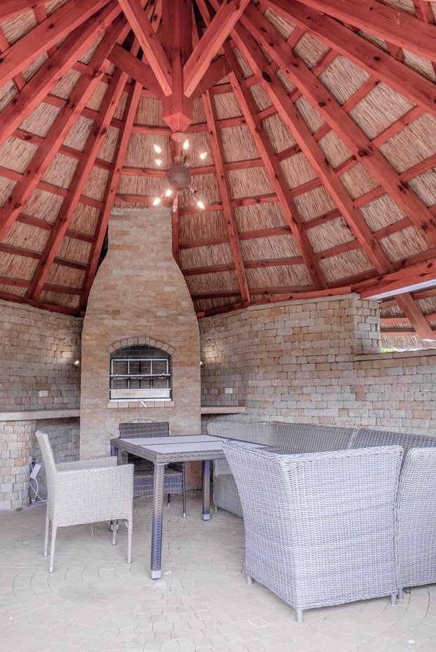 Altana ogrodowa z grillem, kryta strzechą, doskonała do organizowania spotkań towarzyskich.