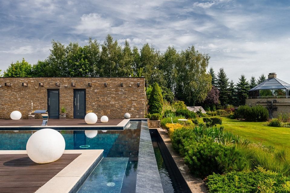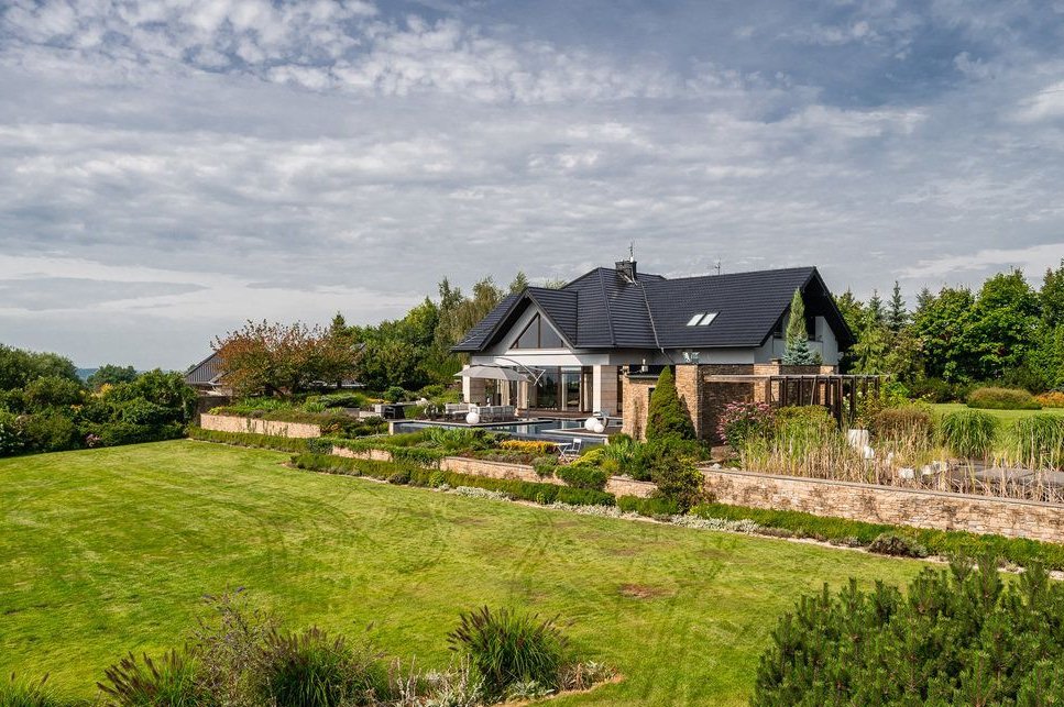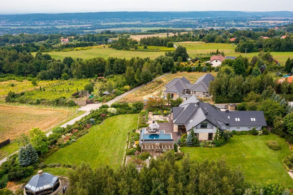 Willa o powierzchni ok. 750 m² położona jest na działce liczącej 8 000 m² (80 arów), otoczona pięknie zagospodarowanym ogrodem z licznymi nasadzeniami, tarasem ok. 350m² oraz prywatnym basenem. Dom został zaprojektowany z myślą o najbardziej wymagających klientach, oferując nowoczesne rozwiązania technologiczne oraz luksusowe wykończenia z najwyższej jakości materiałów.