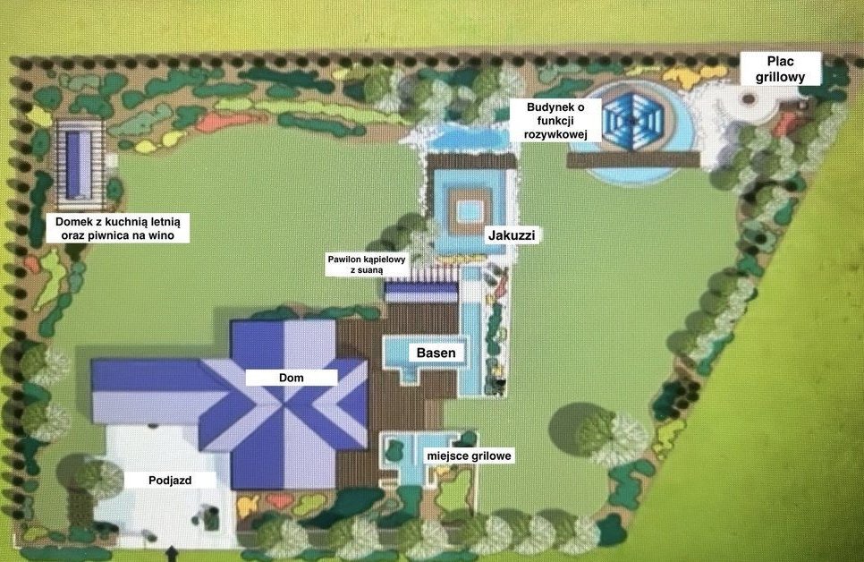 - Taras ok 350 m2 wokół domu i basenu wraz z budynkiem w którym znajduje się (zewnętrzna sauna; WC; technika basenowa; pomieszczenie techniczne oraz grill);