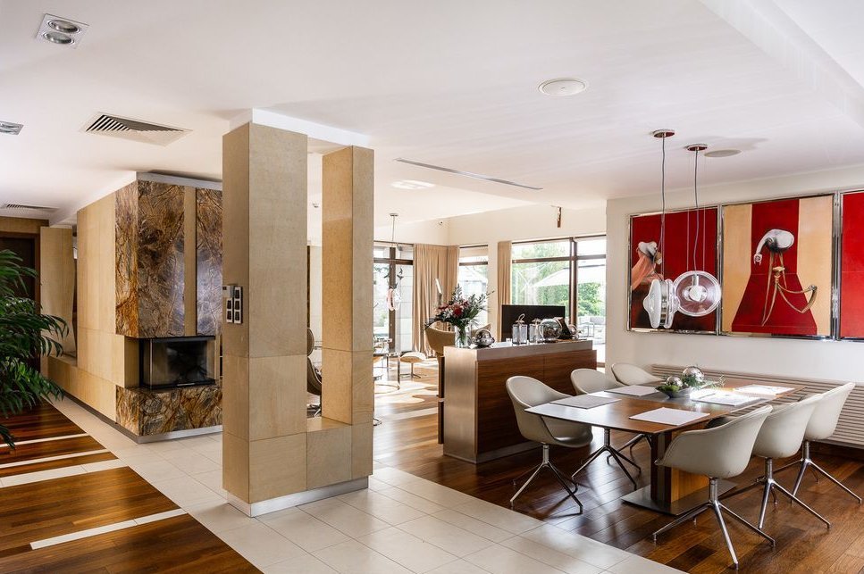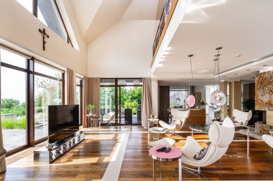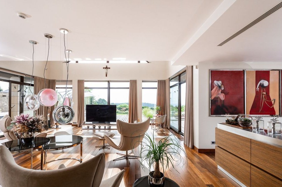 Wnętrze willi to kwintesencja elegancji i komfortu. Przestronny salon z kominkiem, wysoka na 4 metry sufitowa przestrzeń dzienna oraz panoramiczne okna wychodzące na ogród zapewniają niezwykłe doznania wizualne i przestrzenne. Kuchnia z pełnym wyposażeniem w nowoczesny sprzęt AGD, połączona z jadalnią, tworzy idealne miejsce do spotkań towarzyskich i rodzinnych.