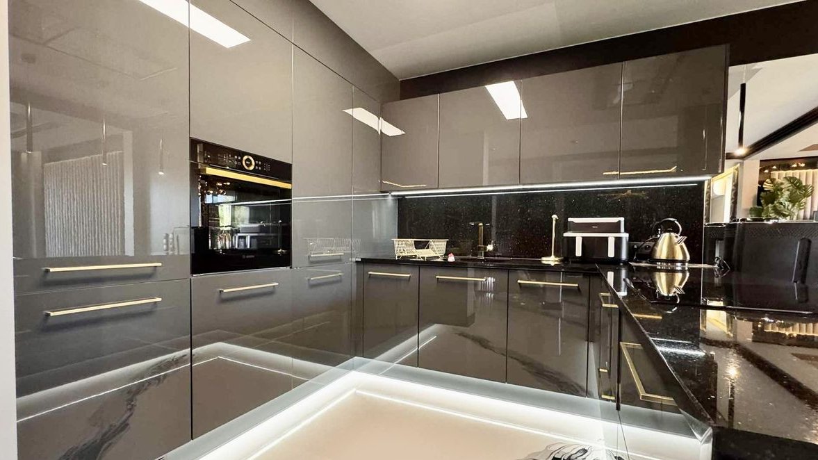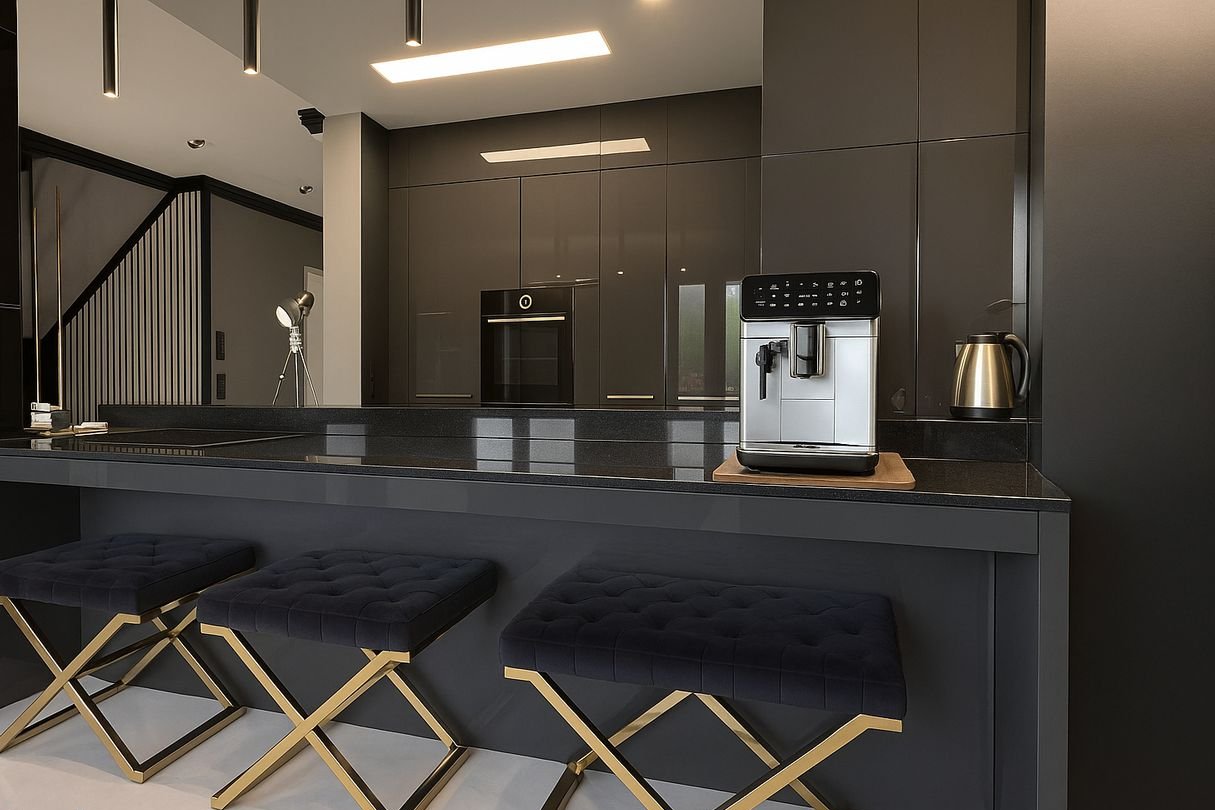 Ekskluzywna kuchnia marki Mebel Rust z podwójnie lakierowanymi frontami, blatami z kamienia naturalnego oraz sprzętami ze stali szlachetnej
