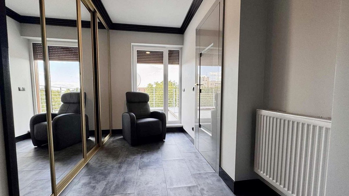 Ten niezwykle stylowy, dwupoziomowy apartament o powierzchni 148 m² z przestronnym tarasem (ponad 65 m²), balkonem i poddaszem użytkowym, mieści się w kameralnym, nowoczesnym budynku szeregowym z 2012 roku. Wyróżnia się nie tylko luksusowym wykończeniem, ale również doskonałą lokalizacją – w otoczeniu niskiej, willowej zabudowy, z szybkim dostępem do centrum miasta i obwodnicy.