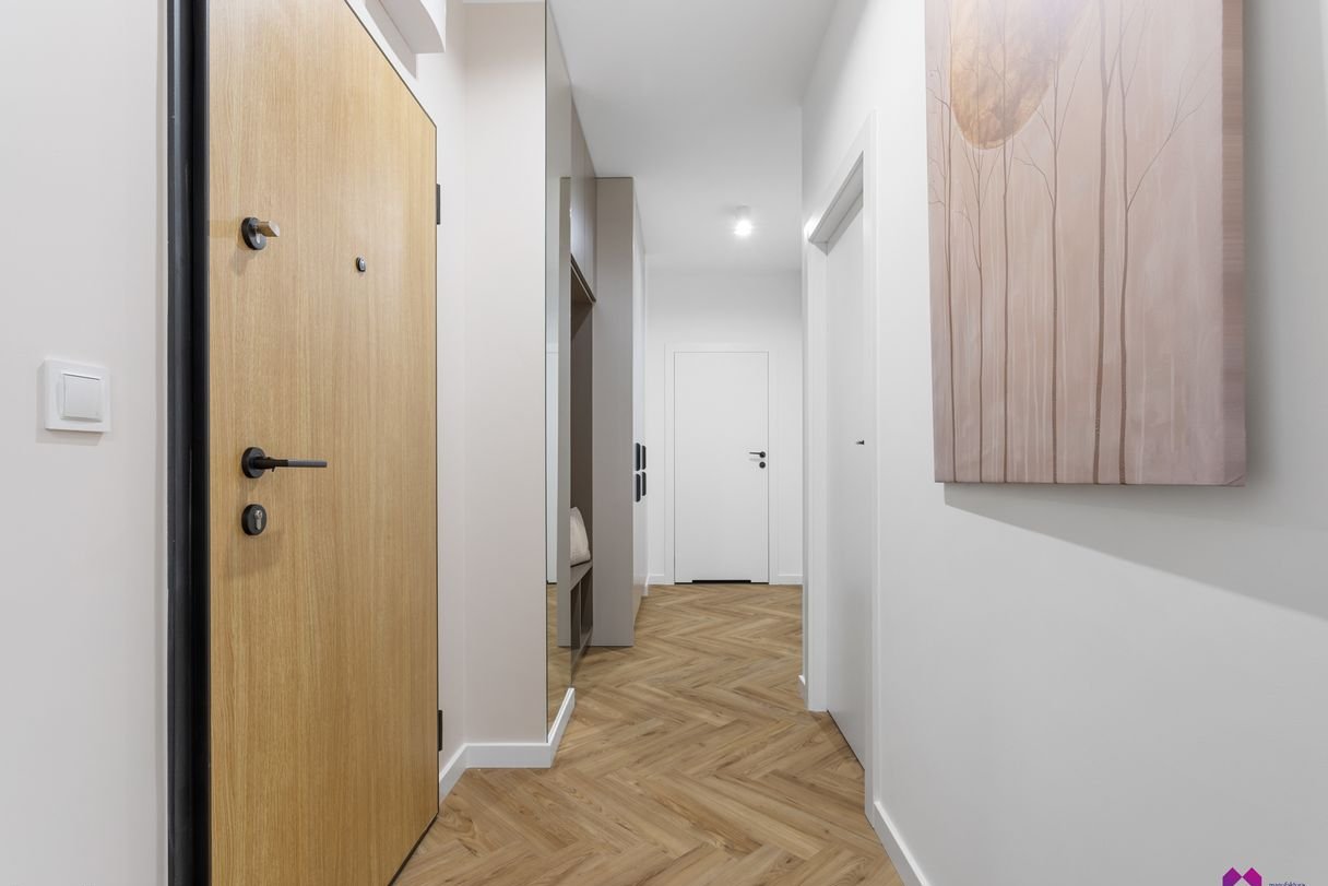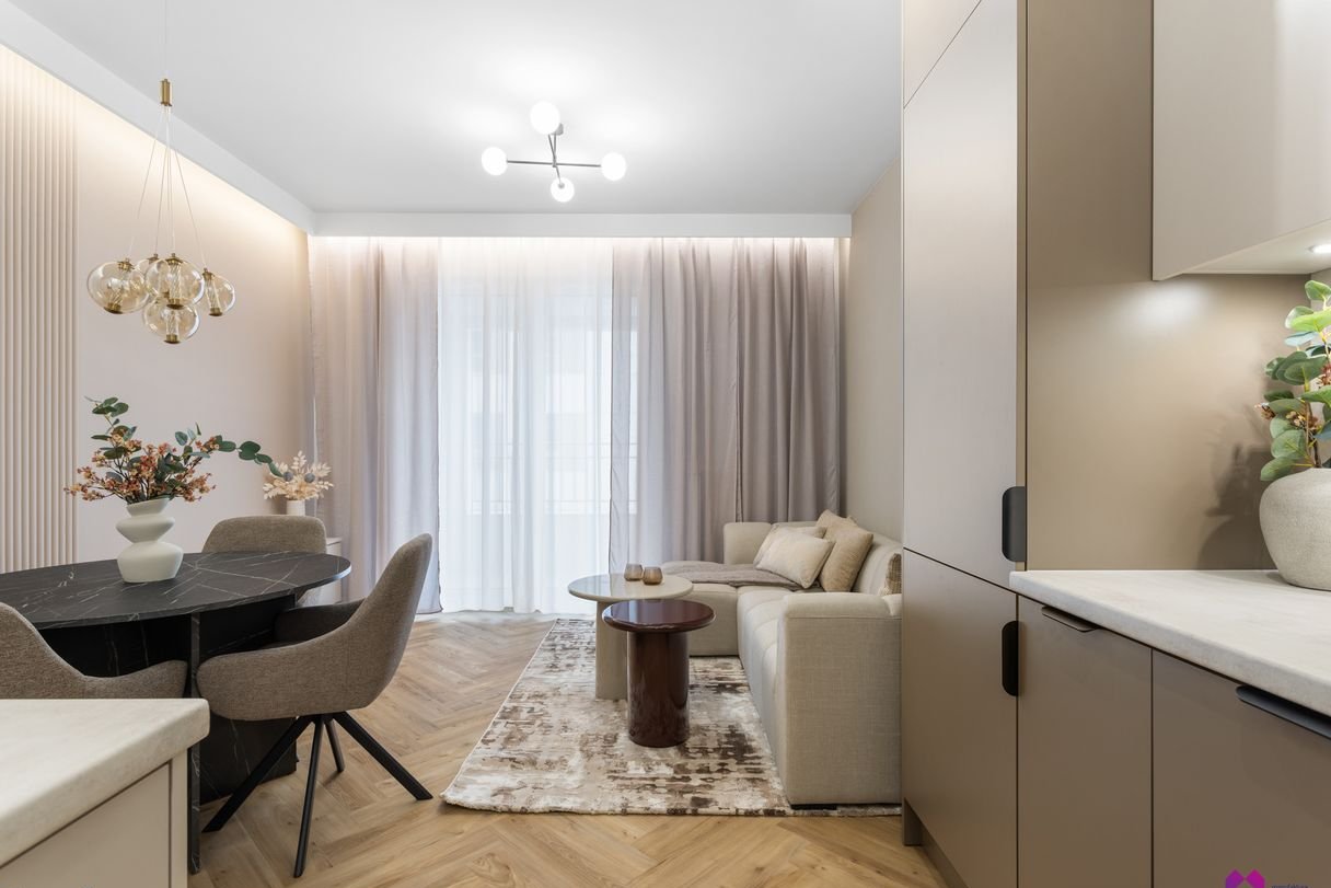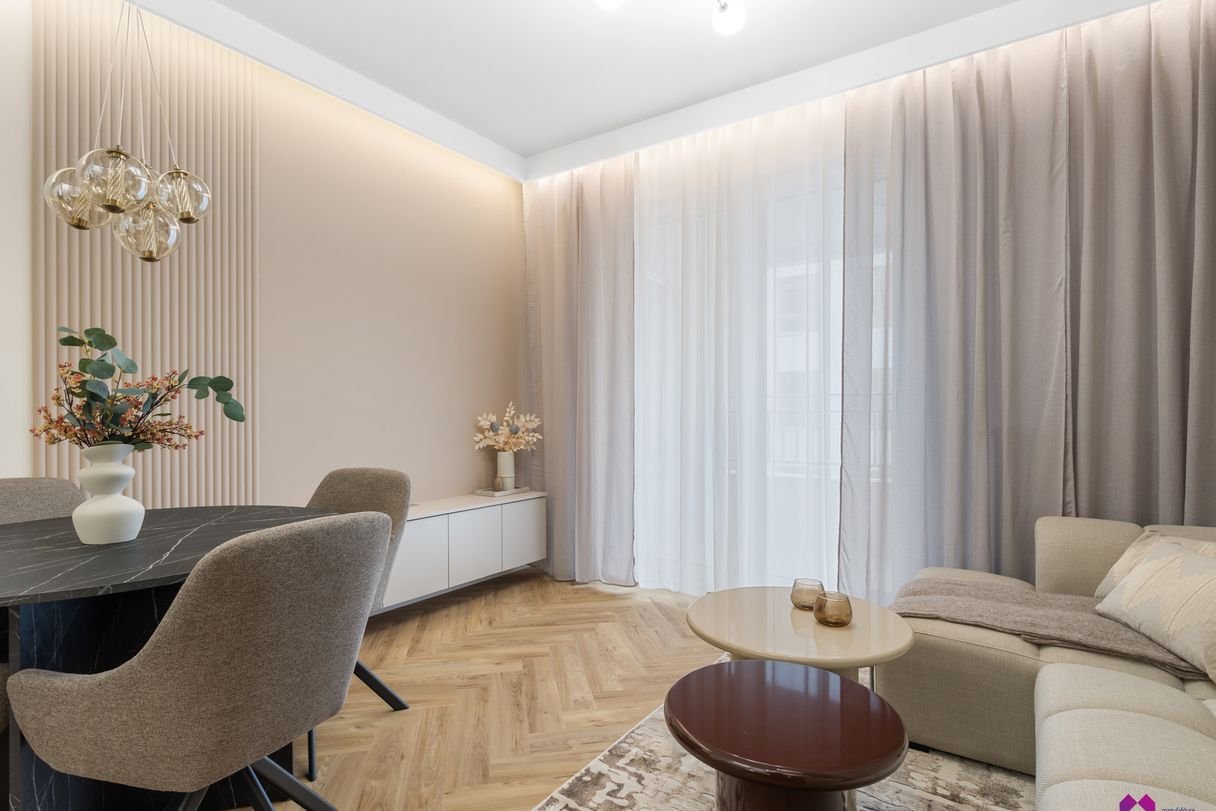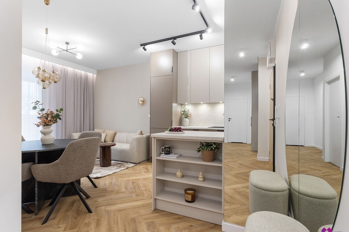 Mieszkanie wykończone pod klucz w podwyższonym standardzie w stylu nowoczesnym według najnowszych trendów. We wnętrzu panują odcienie beżu, drewna, brązu oraz grafitu co sprawia, że mieszkanie jest niezwykle eleganckie i równie przytulne.