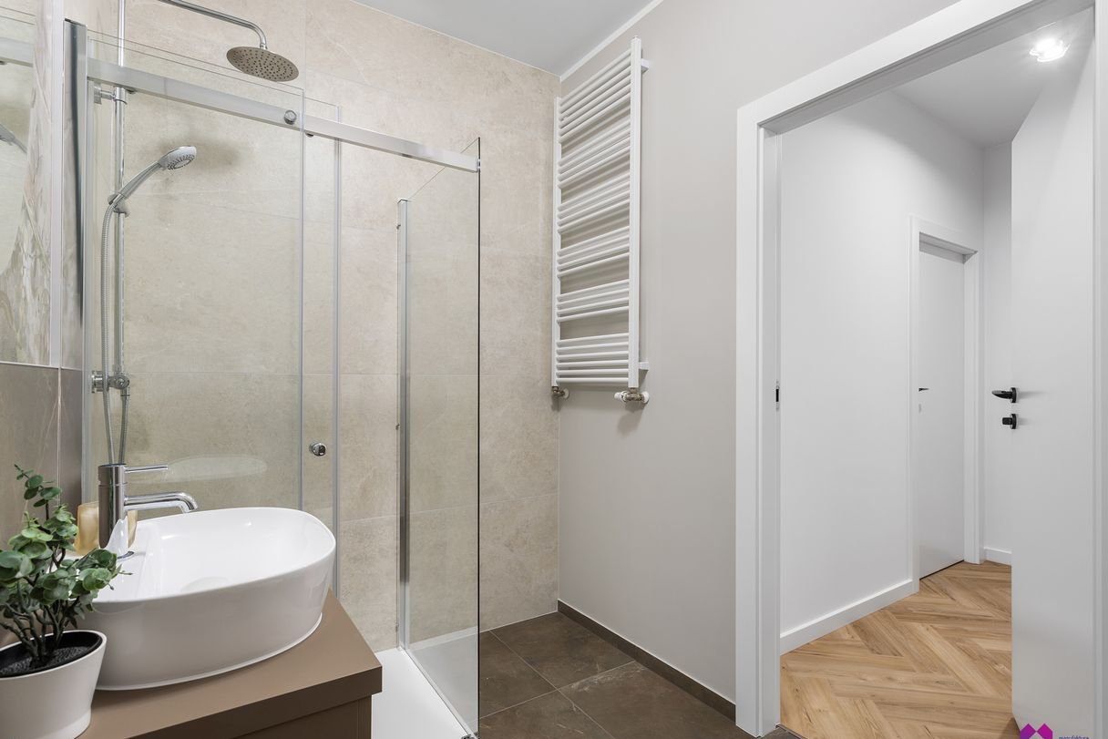 Piękna łazienka zaprojektowana została w stylu pokoju kąpielowego, a wyposażona jest w kabinę prysznicową, umywalkę z pojemnymi szufladami, szafki do przechowywania, a także przygotowano we wnęce miejsce na pralkę.