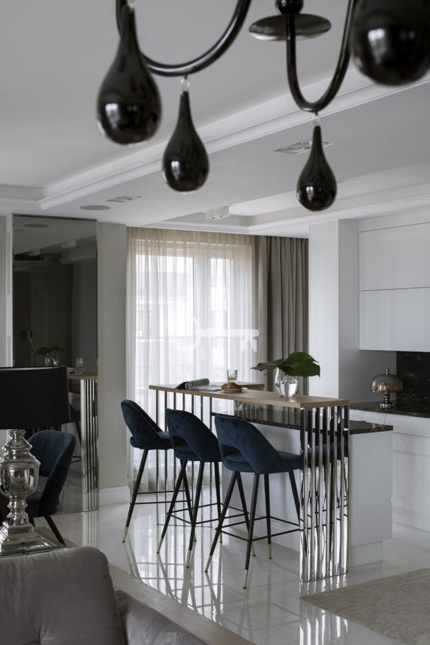 Apartament został zaprojektowany przez renomowaną pracownię FIND-DESIGN, co gwarantuje najwyższą estetykę i staranność w każdym detalu. Ściany zdobią wysokiej jakości farby marki Benjamin Moore oraz luksusowe francuskie tapety. Oświetlenie to ekskluzywne lampy marek Masiero, Eichholtz i Astro, a meble pochodzą od renomowanych producentów, takich jak Joop, Cedros i Klimek & Klimek. Ceramika i armatura to dzieła uznanych marek: Duravit, Kaldewei, Hansgrohe, Grohe oraz Villeroy & Boch.