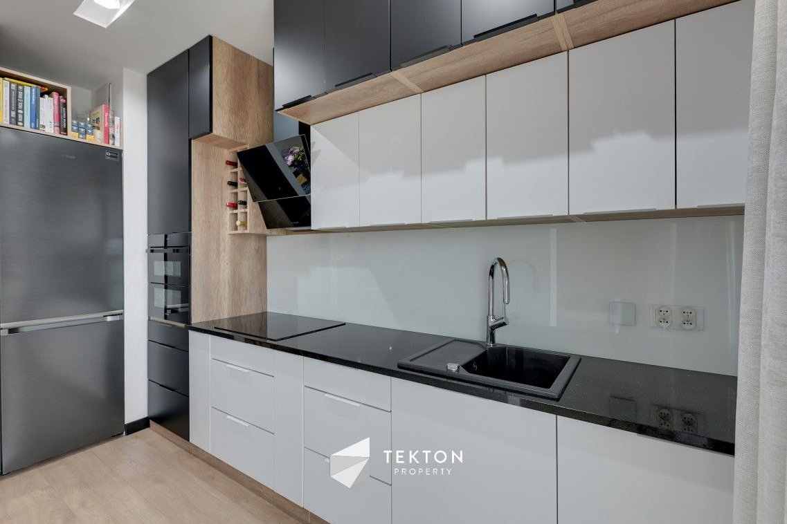 - Przestronnego salonu z aneksem kuchennym o powierzchni aż 33,3 m², który stanowi serce nieruchomości. Przemyślany układ pozwolił na subtelne oddzielenie aneksu ścianką, na której umieszczono TV oraz nastrojowy biokominek, tworząc niepowtarzalny klimat,