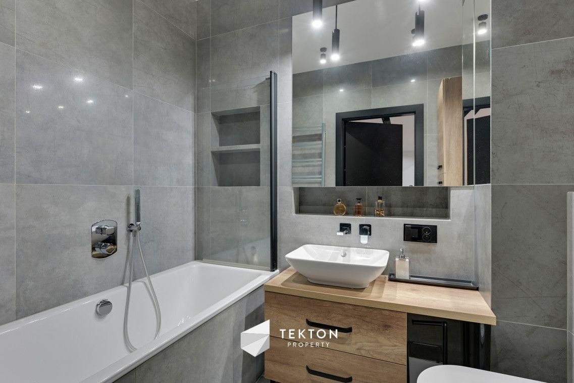 - Łazienki o powierzchni 4,2 m² została wyposażona w nowoczesną stalową wannę oraz meble wykonane na indywidualne zamówienie,