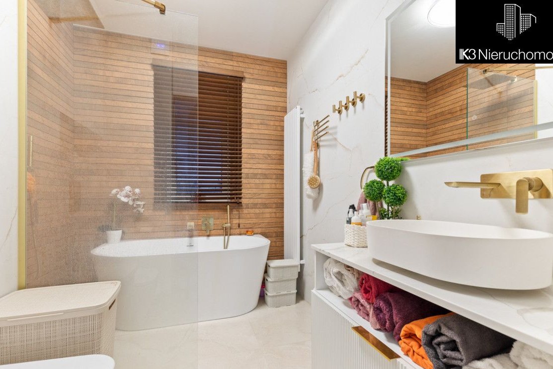 Wnętrze zaprojektowano z dbałością o każdy detal. W całym domu (salon, kuchnia, sypialnie, pokoje) zastosowano nowoczesne sufity naciągane z wbudowanym, designerskim oświetleniem. Komfort termiczny zapewnia ogrzewanie podłogowe (centralne) rozprowadzone na całym parterze oraz we wszystkich łazienkach. Wyjątkowym atutem są elektrycznie podgrzewane schody oraz podgrzewane ściany w miejscach przeznaczonych na wieszaki z ręcznikami.