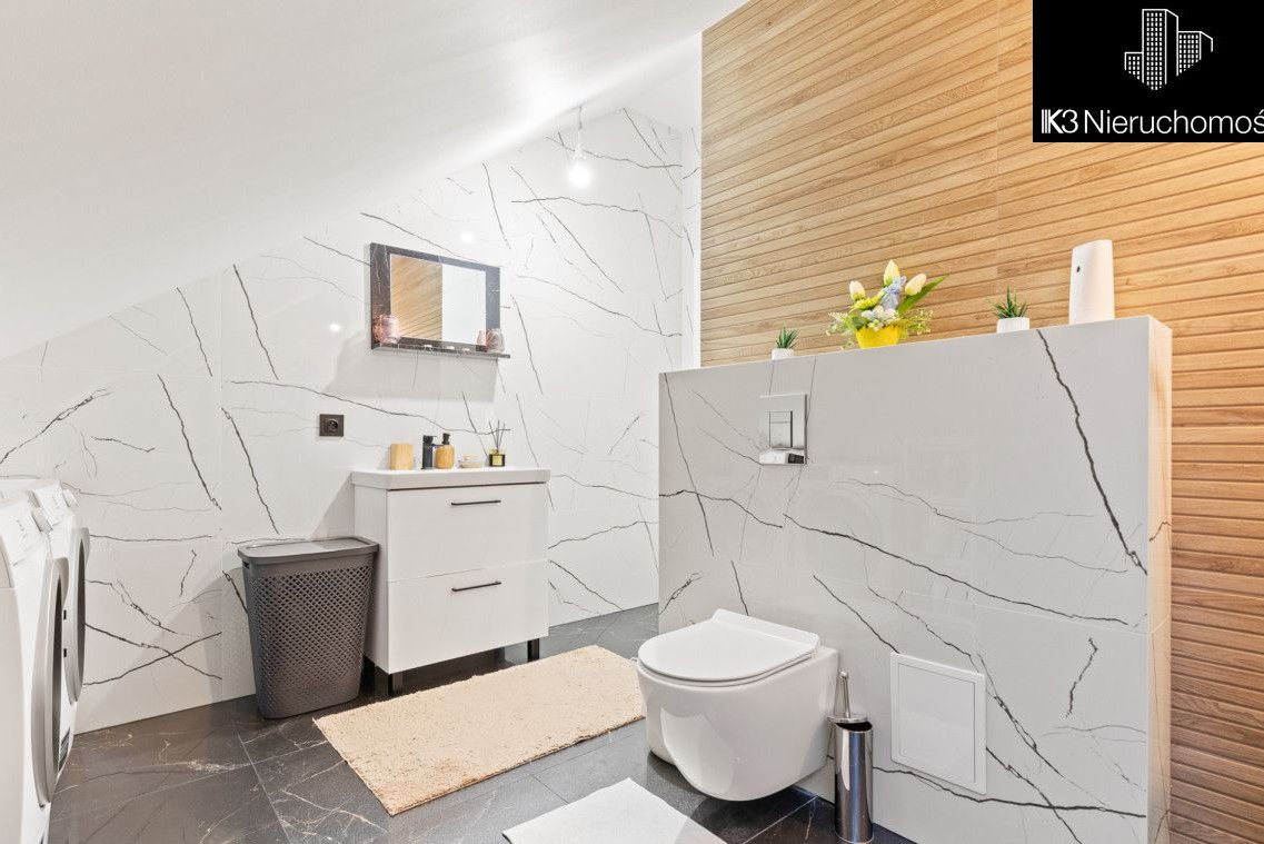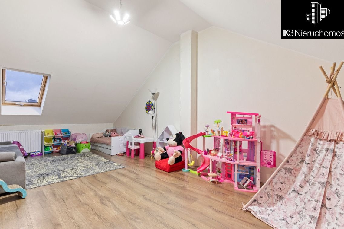 Poddasze: Dodatkowa przestrzeń mieszkalna, w skład której wchodzi sypialnia z prywatną łazienką, osobna łazienka oraz pokój zabaw (możliwość aranżacji na biuro).