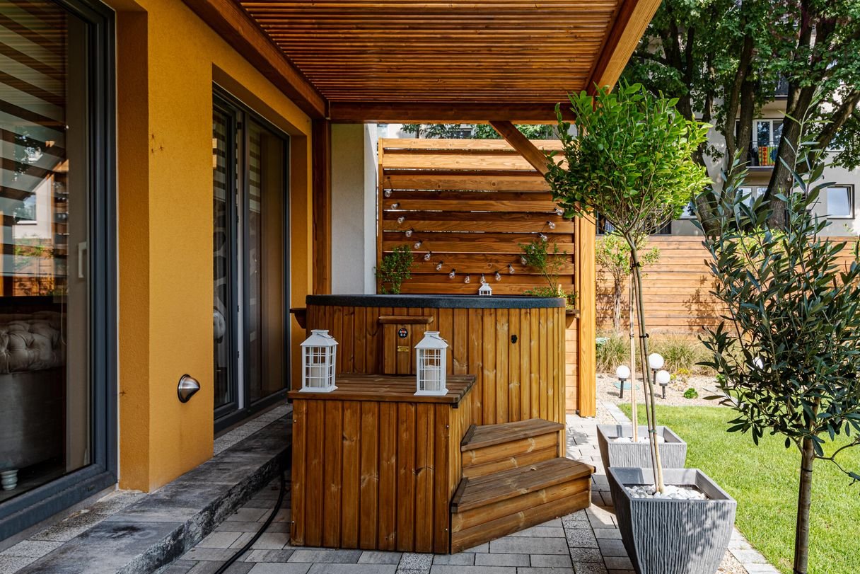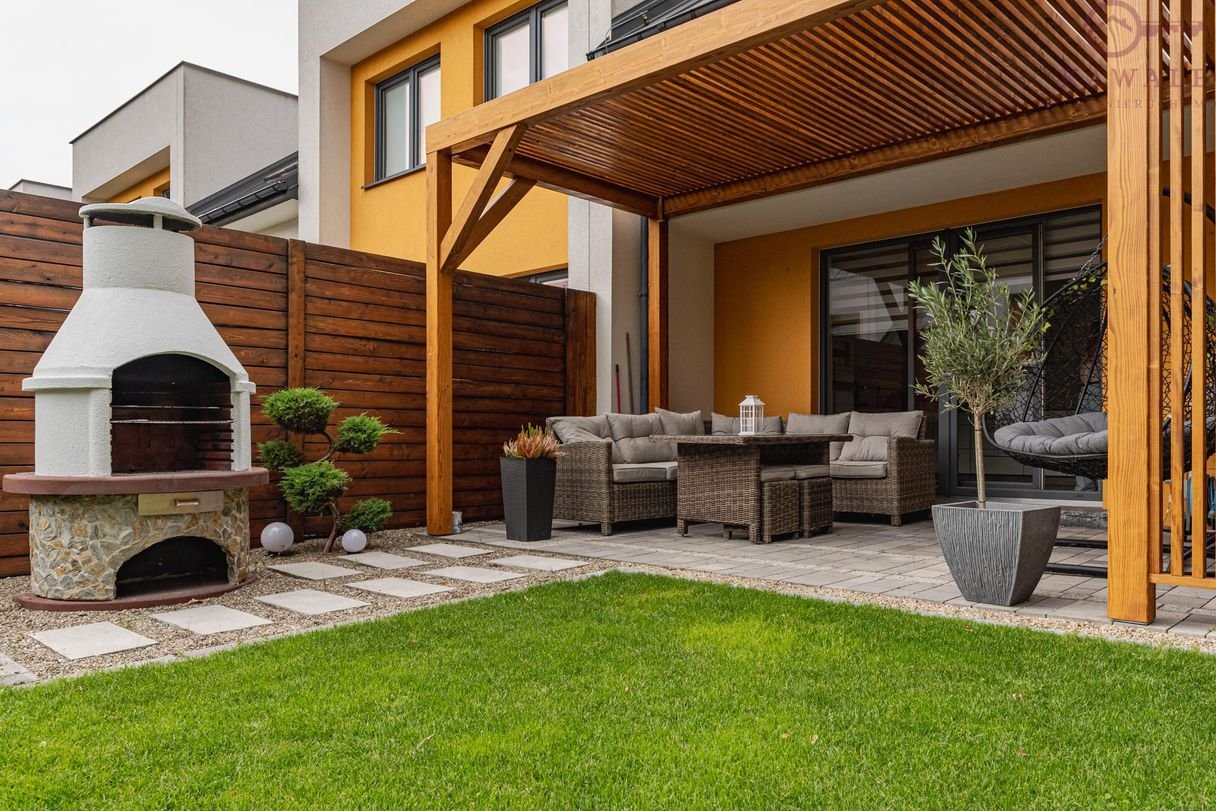 Przestronny, piękny ogród z pergolą 9x2,4 m, wanna Scandi Spa, grill betonowy, meble ogrodowe, huśtawka kokonowa, oraz różnorodne nasadzenia: tuje, modrzewie, drzewa oliwne, choinki i krzewy ozdobne. Ogród z automatycznym nawodnieniem i strefą wypoczynkową, idealny do spędzenia czasu z rodziną i przyjaciółmi. Dodatkowym atutem są lampy solarne w ogrodzie które dodają wyjątkowego charakteru ogrodowi o zmierzchu a przy tym nie wymagają dodatkowych nakładów finansowych.