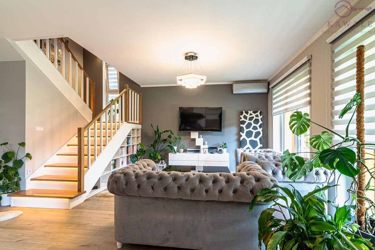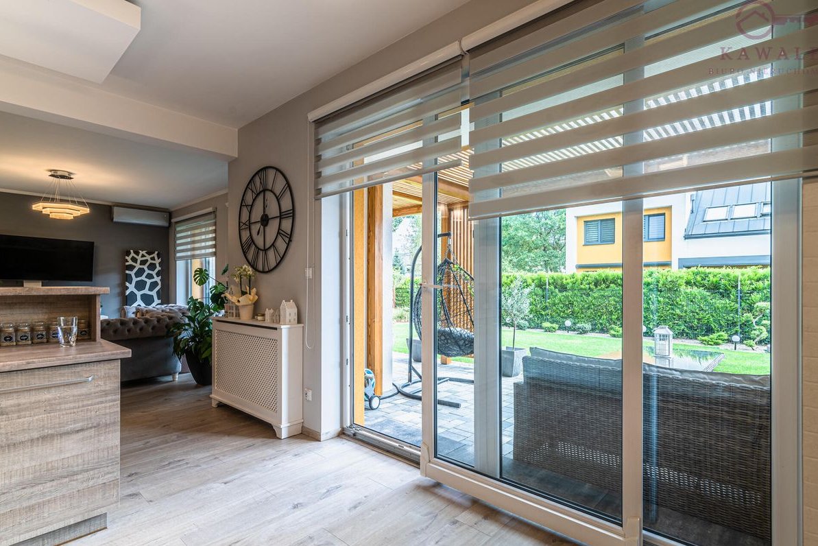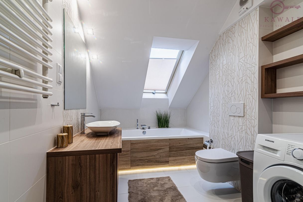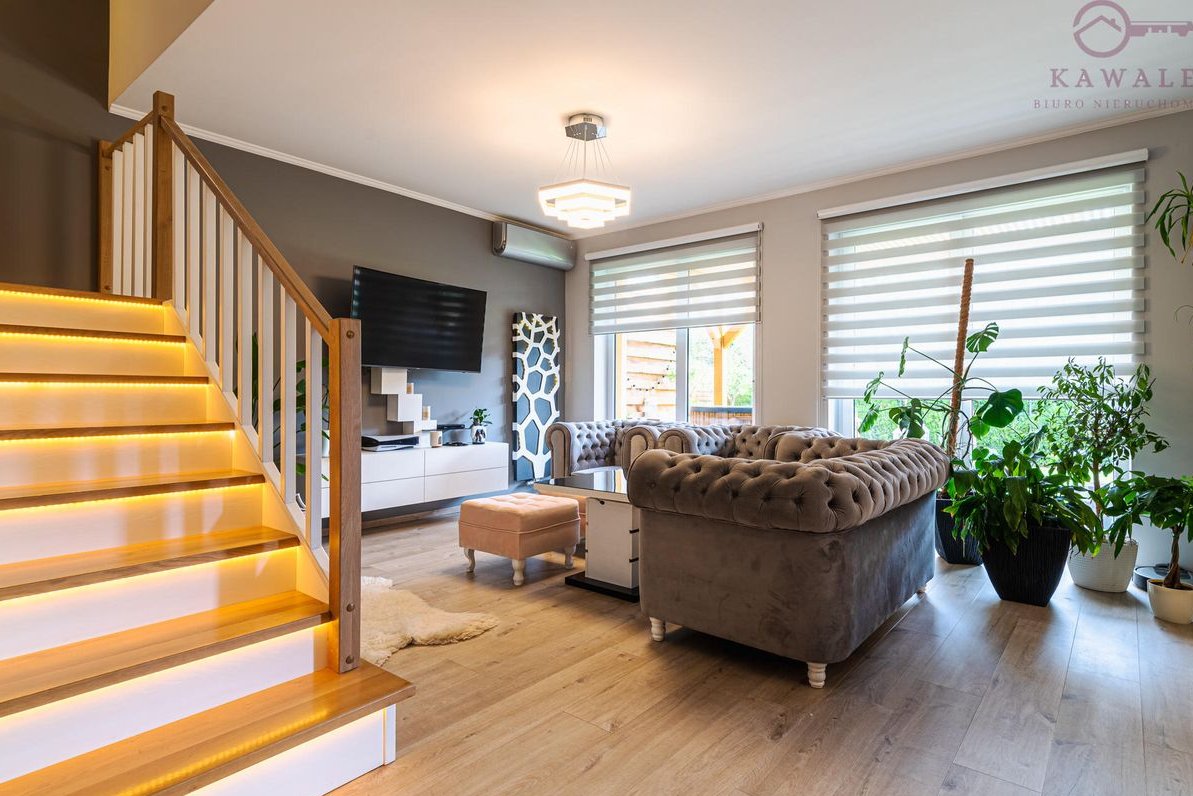 Jasny i funkcjonalny salon z panoramicznymi przesuwanymi oknami 3 szybowymi oraz unikalnym zestawem wypoczynkowym w stylu Chesterfield, tapicerką plamoodporną, zabudowaną wnęką pod schodami z regałem na książki. Łazienka z dużą wanną powyżej 2 metrów długości, kaskadowym kranem, lustrem i nowoczesnym oświetleniem LED.