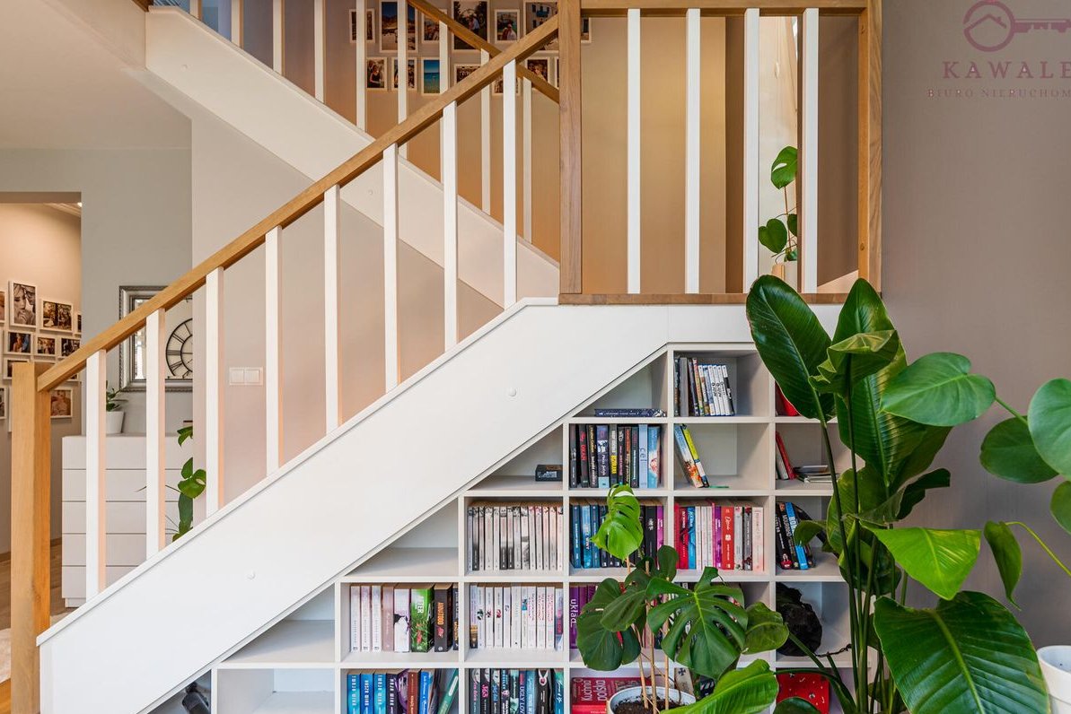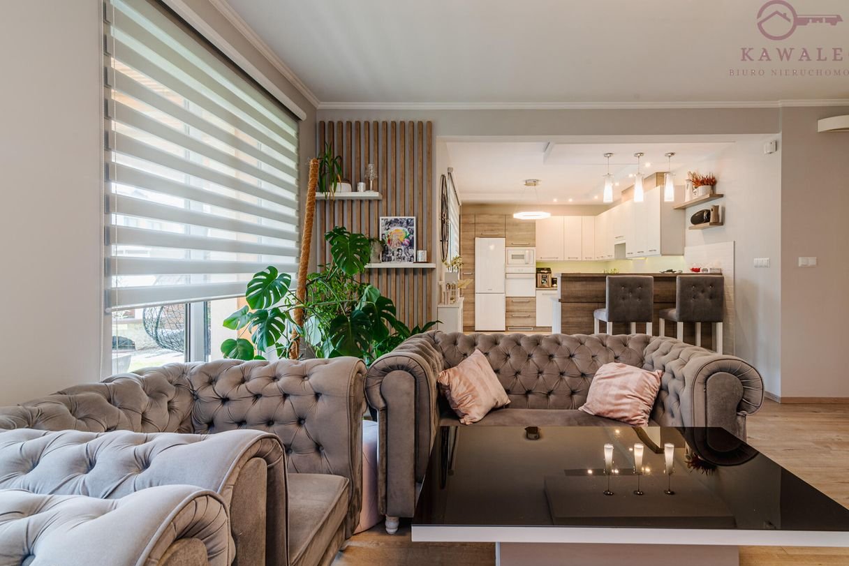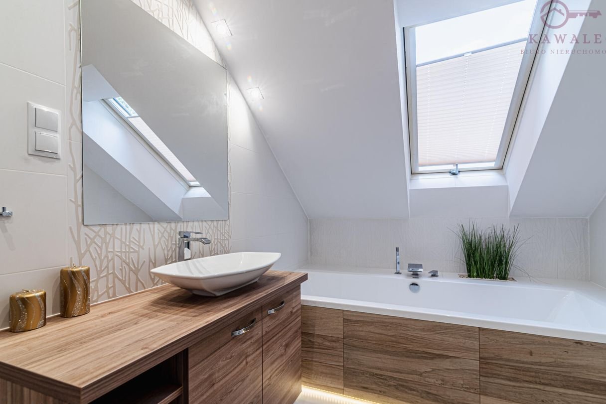 Jasny i funkcjonalny salon z panoramicznymi przesuwanymi oknami 3 szybowymi oraz unikalnym zestawem wypoczynkowym w stylu Chesterfield, tapicerką plamoodporną, zabudowaną wnęką pod schodami z regałem na książki. Łazienka z dużą wanną powyżej 2 metrów długości, kaskadowym kranem, lustrem i nowoczesnym oświetleniem LED.