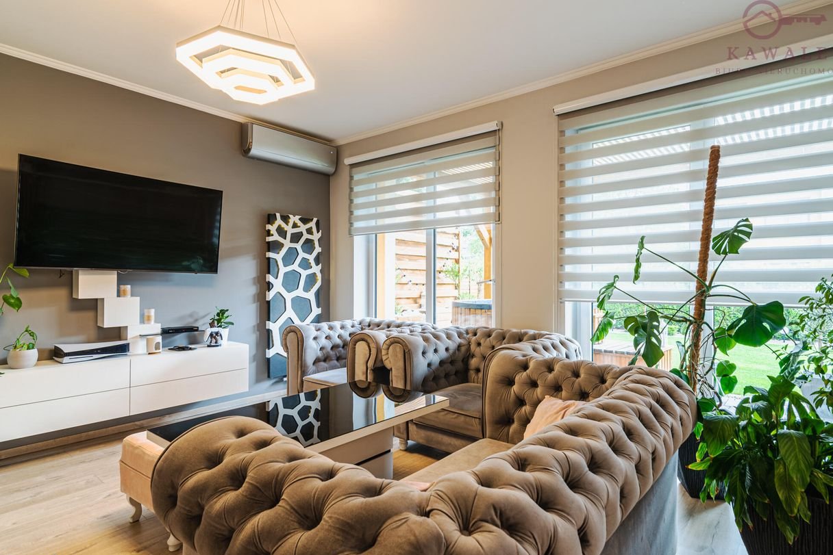 Rozrywka i komfort: telewizor Samsung 55 cali, nowoczesne meble wypoczynkowe, zabudowane na wymiar, duże lustra. System alarmowy z podłączeniem do firmy ochroniarskiej Omega.