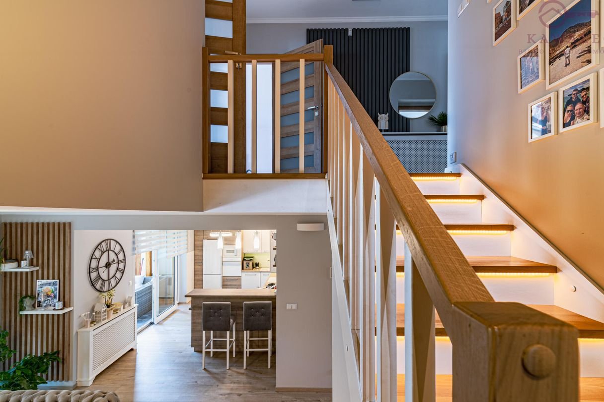 Wyjście na poddasze, które można zaadaptować na dodatkową przestrzeń użytkową. Przestronne i wysokie pomieszczenia z podświetlanymi schodami ledowymi i czujnikami ruchu.