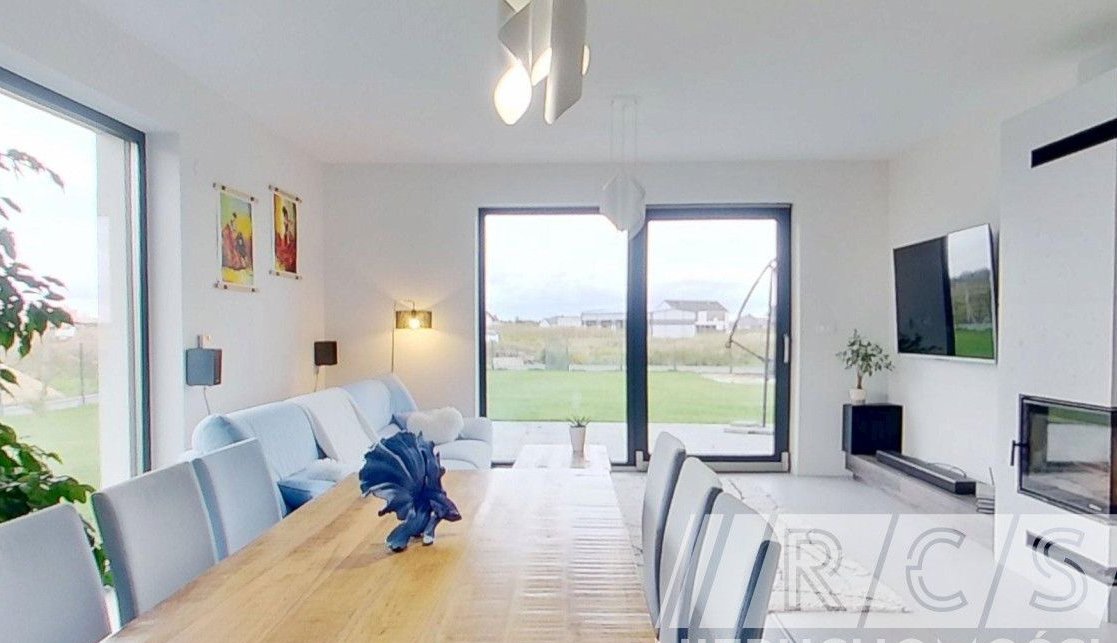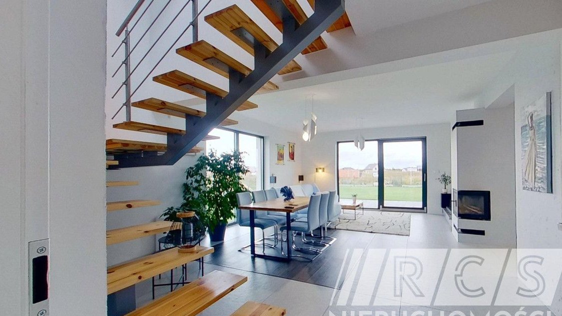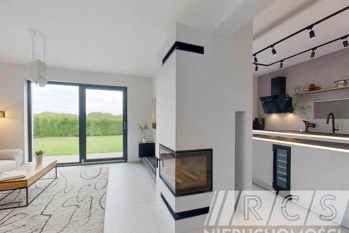 Sercem domu jest jasny, przestronny salon z jadalnią i kominkiem. Duże przeszklenia prowadzą bezpośrednio na taras i ogród, płynnie łącząc wnętrze z otoczeniem. To idealna przestrzeń do codziennego życia, spotkań rodzinnych i wieczornego relaksu.