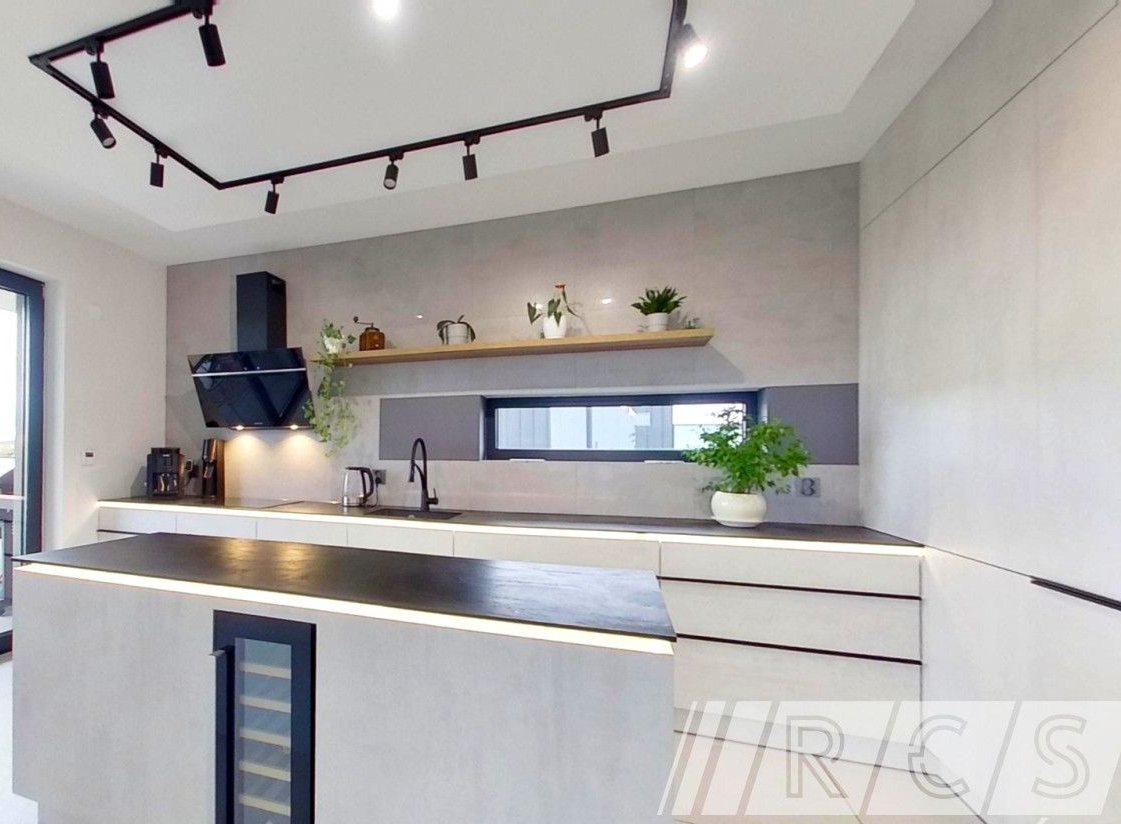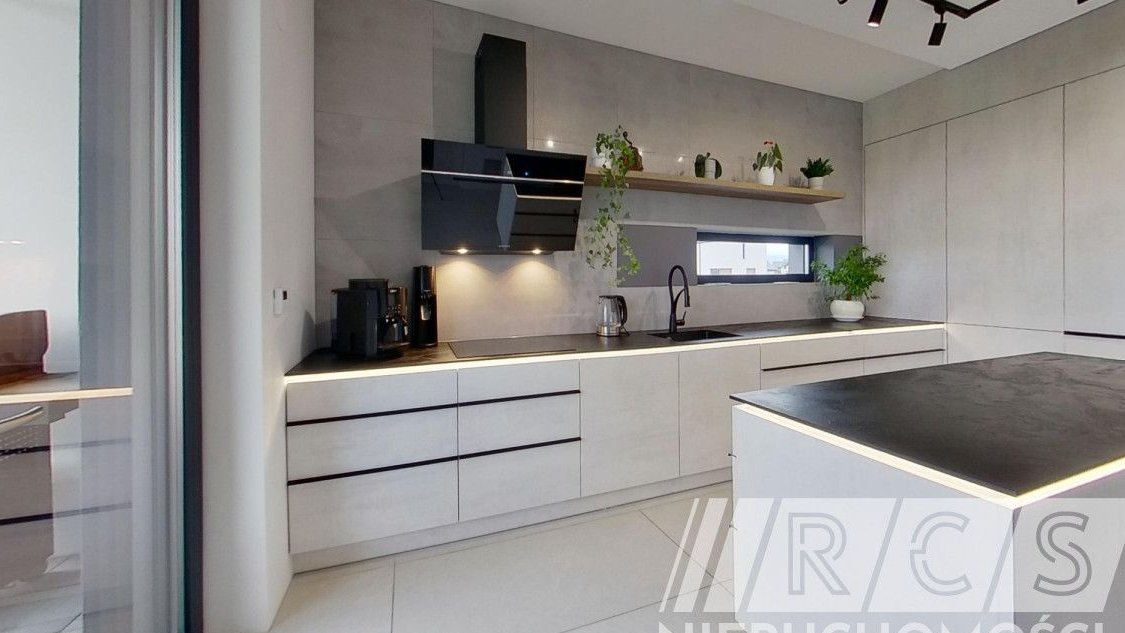 Nowoczesna kuchnia została wykonana na zamówienie i wyposażona w wysokiej klasy sprzęt AGD. Wyspa kuchenna, nastrojowe oświetlenie oraz przemyślany układ sprawiają, że gotowanie staje się przyjemnością, a kuchnia naturalnym miejscem spotkań domowników.