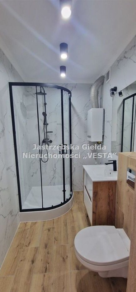 Łazienka wyposażona w prysznic, umywalkę z szafką, wc oraz lustro.