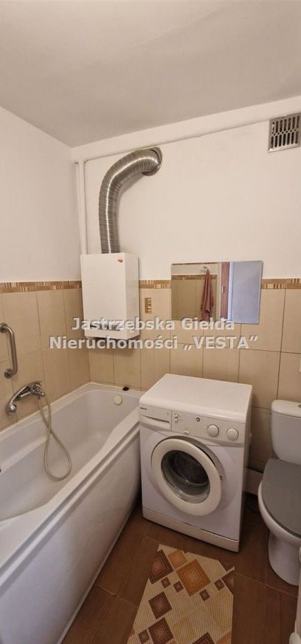 Łazienka w kafelkach na wyposażeniu wanna, pralka,szafka łazienkowa, lustro, nowy junkers i czujnik czadu.