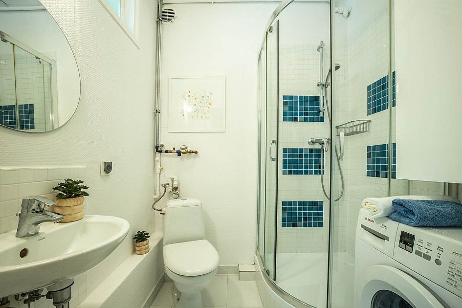 Czysta i zadbana z klasycznym prysznicem, umywalką i pełnowymiarową pralką.