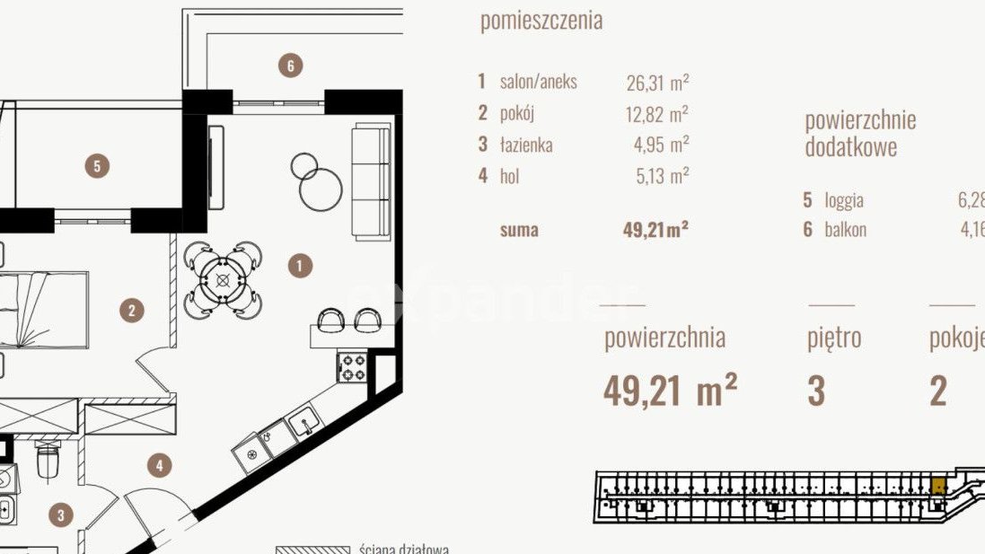 Mieszkanie składa się z przestronnego salonu z aneksem kuchennym, dodatkowego pokoju, łazienki, holu oraz dwóch stref wypoczynkowych na świeżym powietrzu — loggii o powierzchni 6,28 m² oraz balkonu 4,16 m², które stanowią naturalne przedłużenie części dziennej.