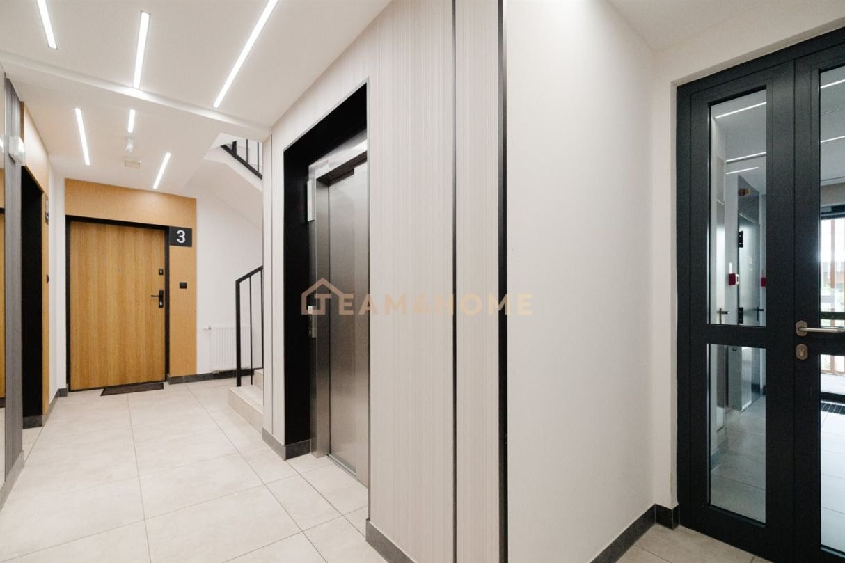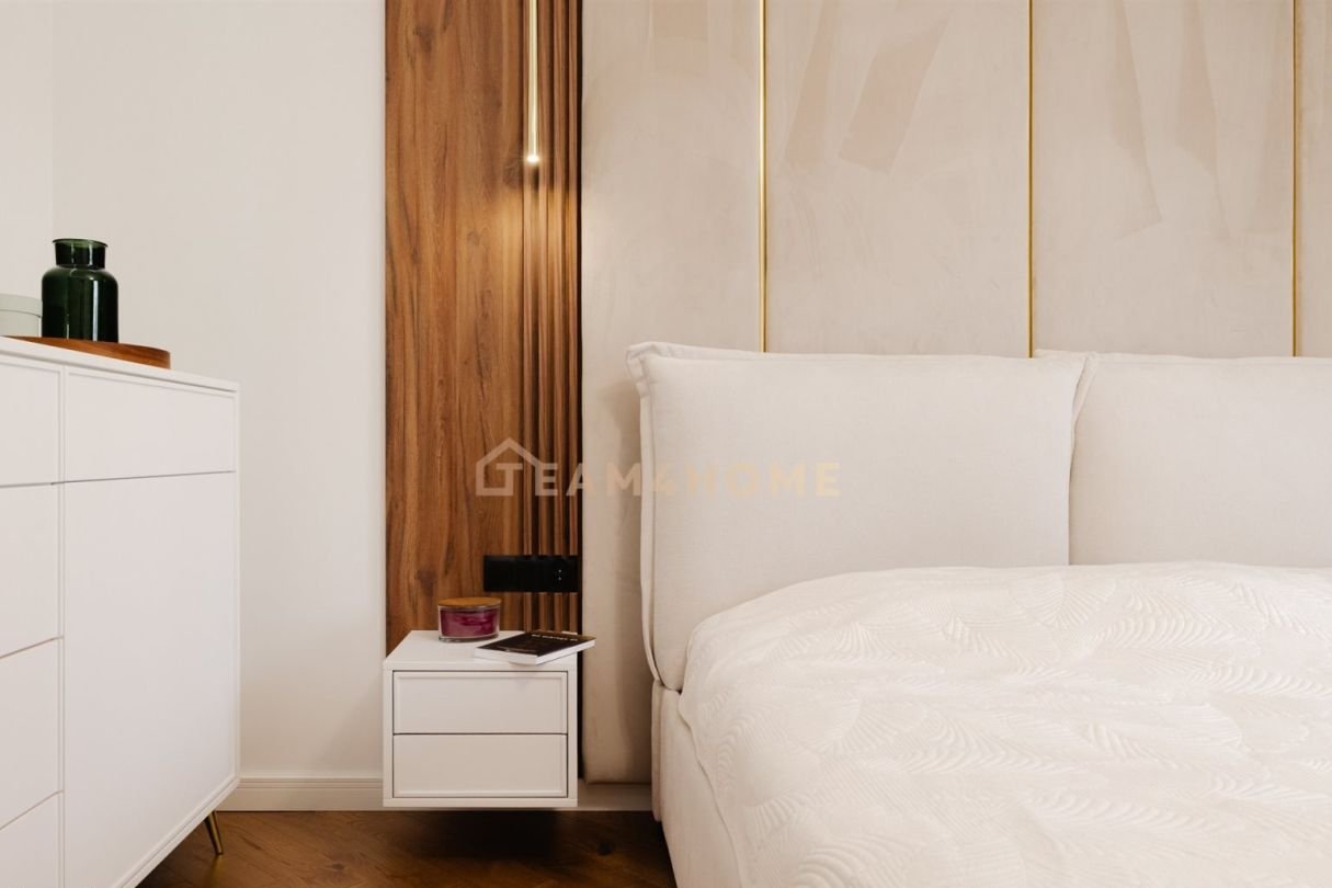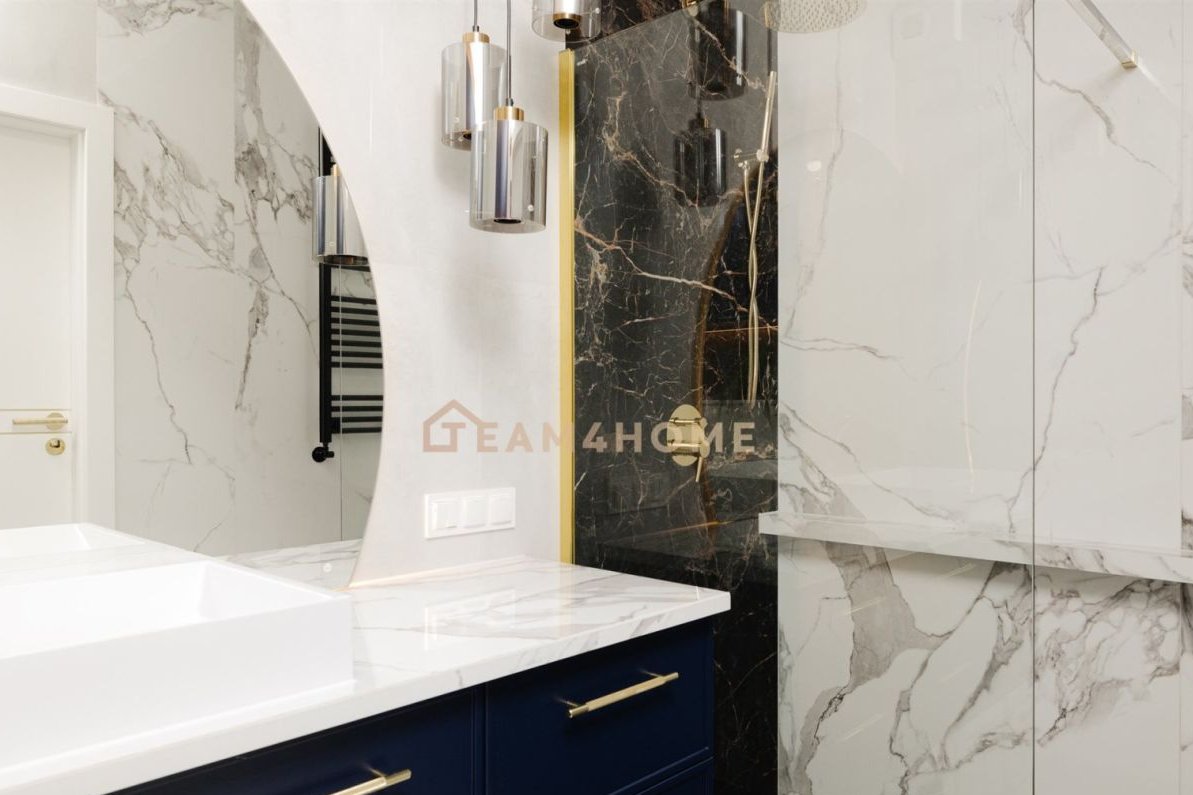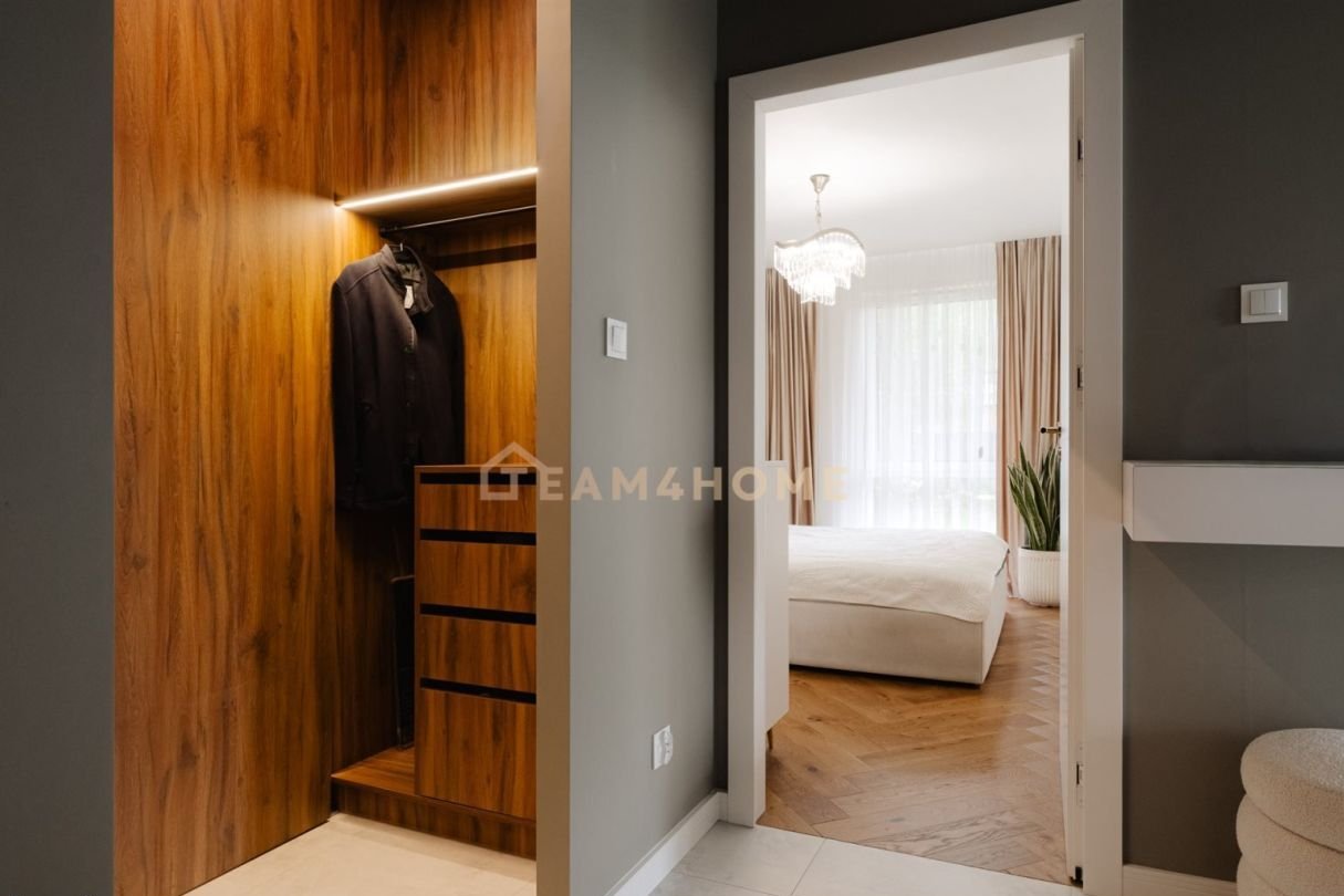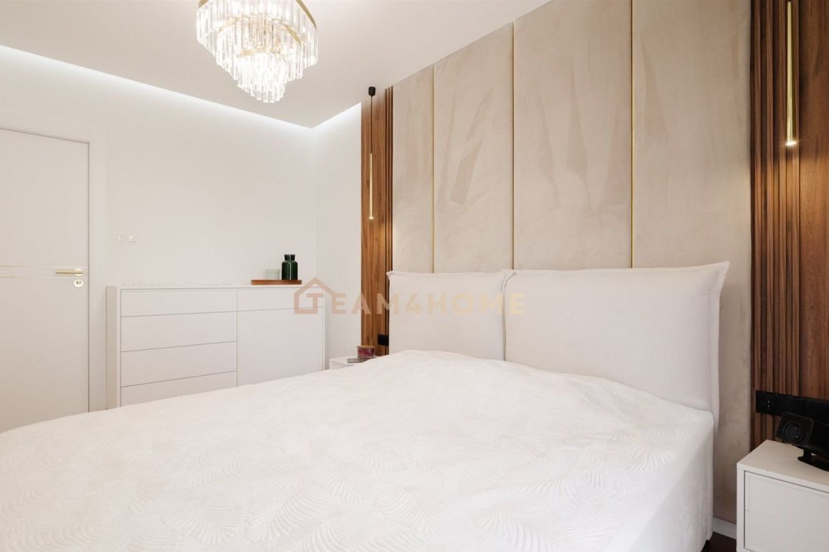 Wysoki standard wykończenia: meble na wymiar, blat z naturalnego kamienia w kuchni, deska barlinecka na podłodze, lustrzane gładzie, Garderoba z pełną zabudową i podświetleniem.