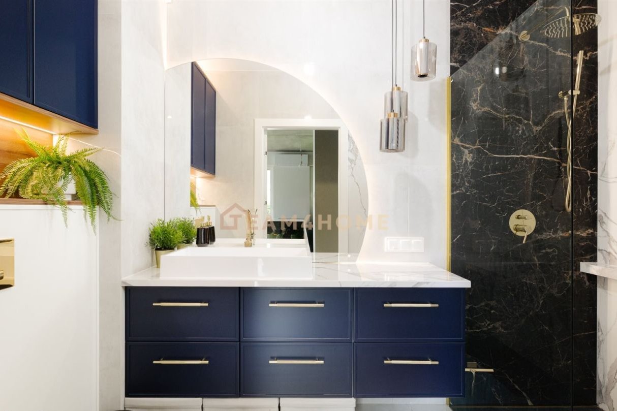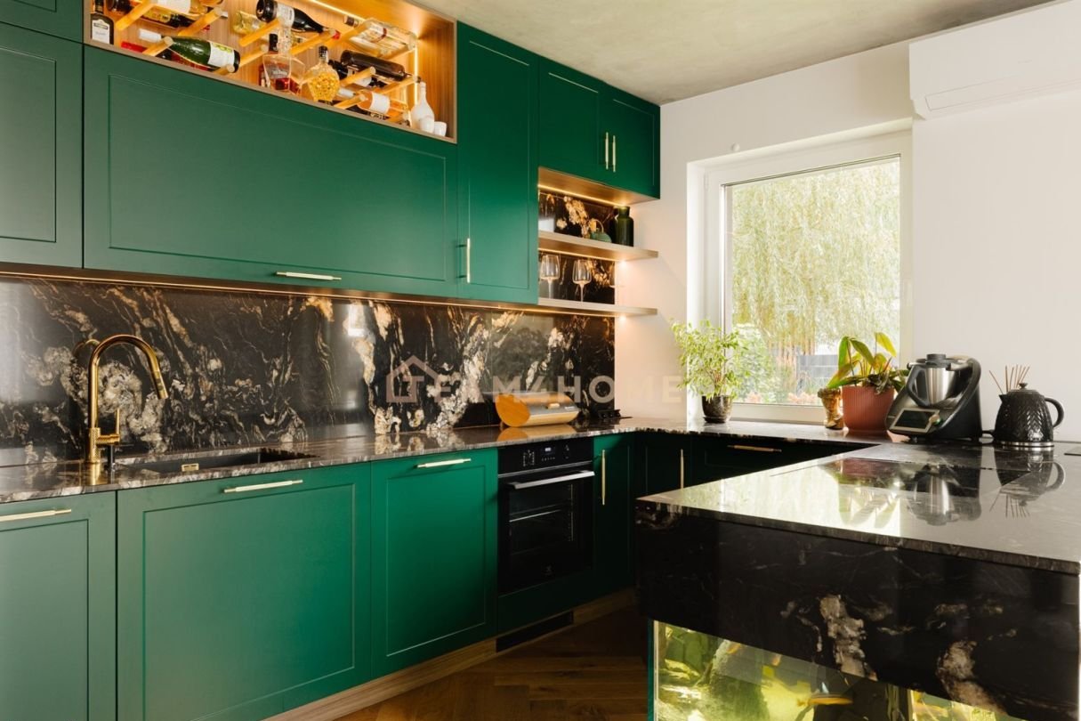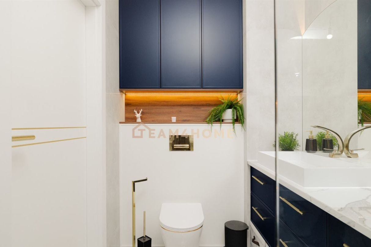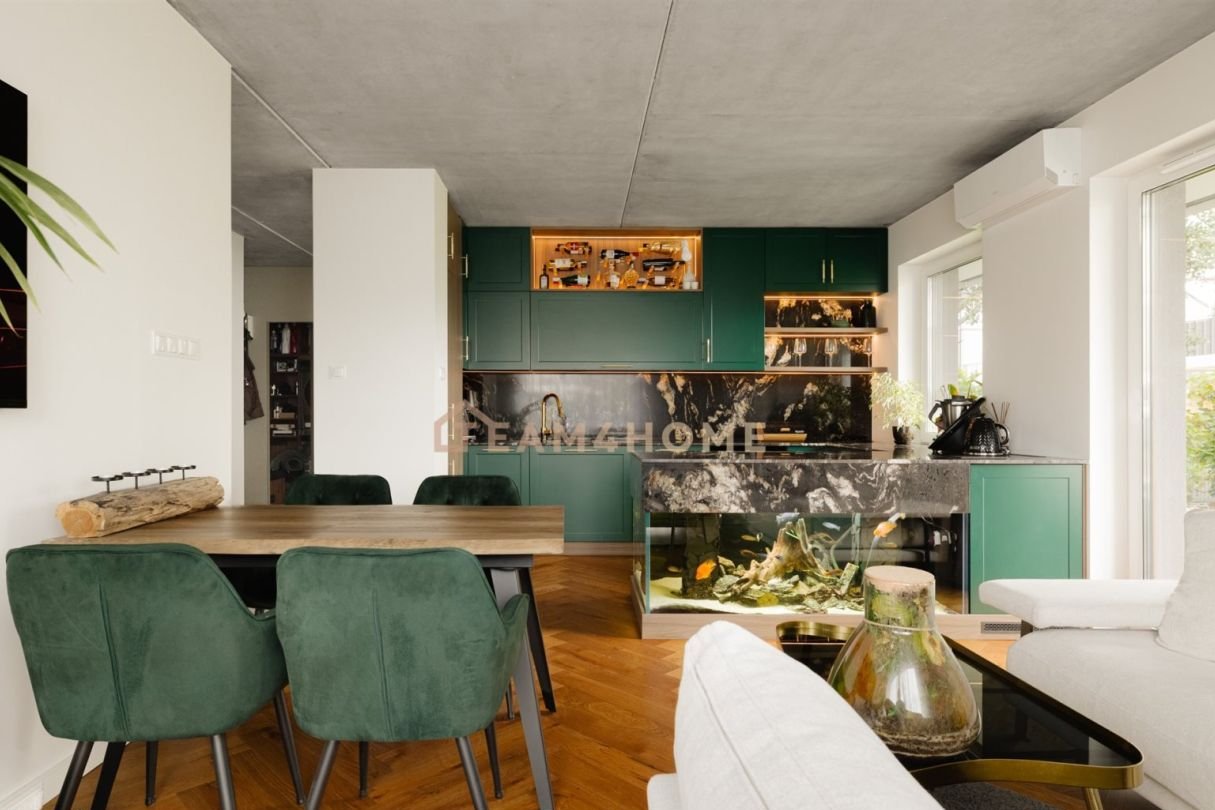 Wysoki standard wykończenia: meble na wymiar, blat z naturalnego kamienia w kuchni, deska barlinecka na podłodze, lustrzane gładzie, Garderoba z pełną zabudową i podświetleniem.