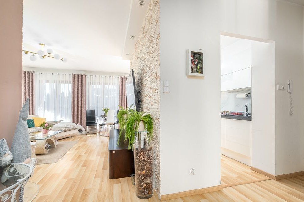 Dużym atutem nieruchomości jest przestronny garaż o powierzchni aż 42 m², znajdujący się w bryle budynku. posiadający osobną księgę wieczystą Bez problemu mieszczą się w nim dwa duże samochody, a dodatkowa przestrzeń może pełnić funkcję magazynu, warsztatu lub komórki do przechowywania sprzętu. Zakup garażu jest obligatoryjny cena 100.000 zł