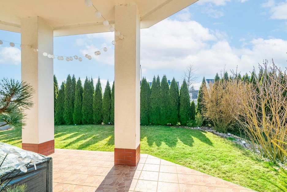Na skraju ogrodu znajduje się wysoki pas zielonych tui, który zapewnia naturalną osłonę i poczucie prywatności.