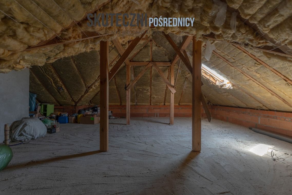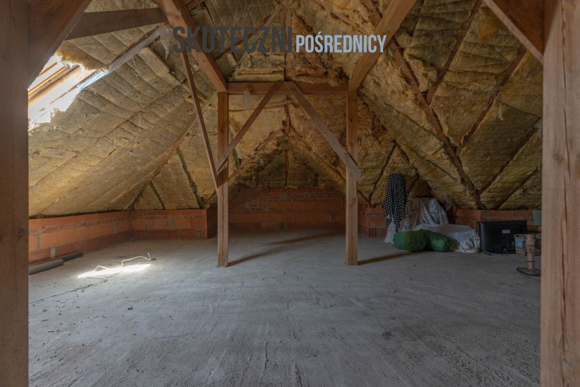Dom parterowy z wysokim, nieużytkowym poddaszem (ocieplonym i z oknem) został oddany do użytku w 2016 roku i posadowiony na dużej, w pełni ogrodzonej działce o powierzchni 2642 m². Parter o powierzchni użytkowej 77,22 m² składa się z jasnej sypialni, osobnej kuchni z miejscem na rodzinny stół, ustawnej łazienki z prysznicem, garderoby z dużą szafą, wiatrołapu, kotłowni oraz przestronnego salonu z wyjściem na taras o powierzchni 16,4 m². To właśnie taras stanowi centrum codziennego życia - idealne miejsce na poranną kawę, obiad w gronie bliskich czy wieczorny odpoczynek.